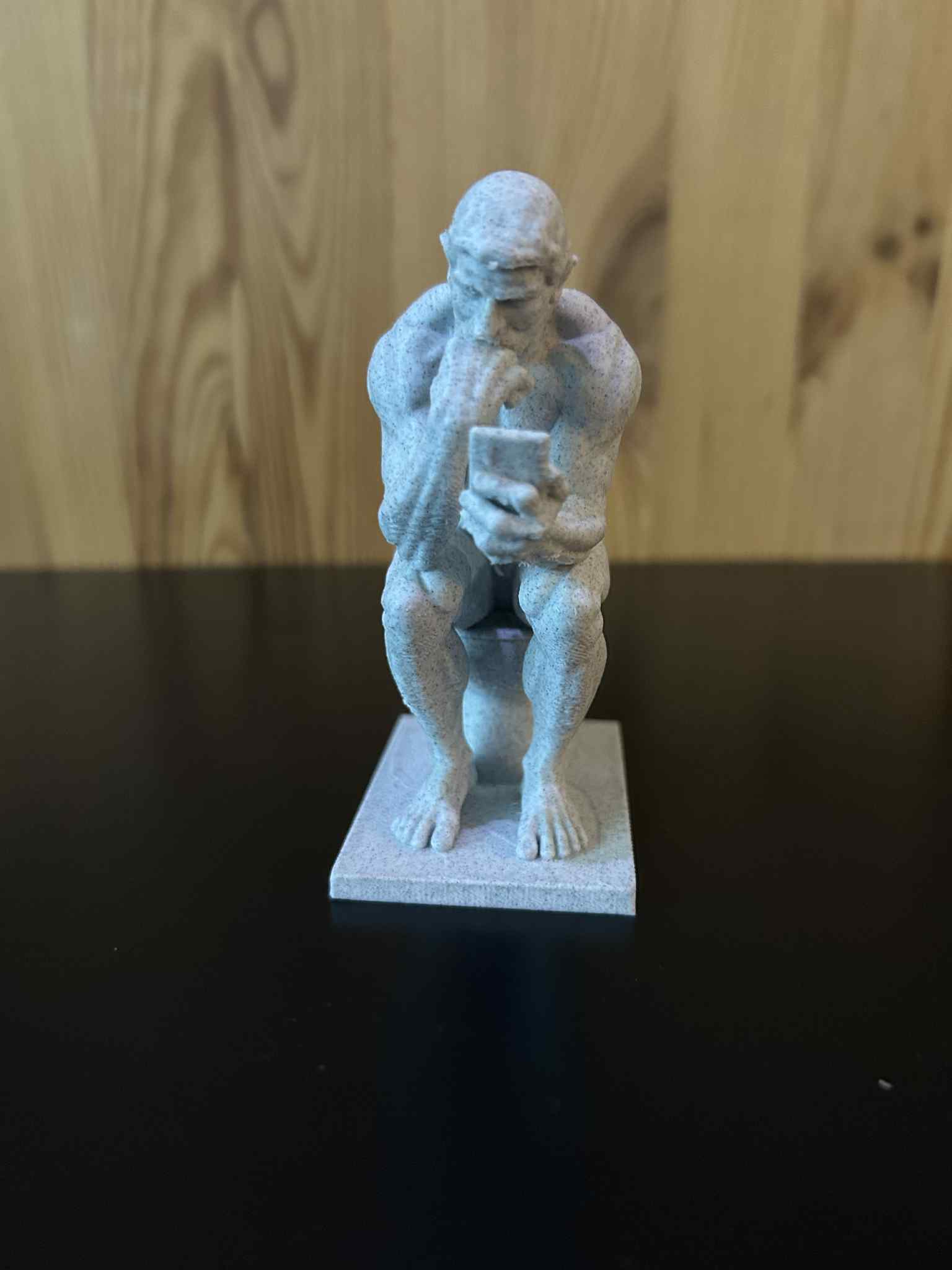 Phiên bản 2.0 của The Thinker, hình dung một nhà hiền triết thời hiện đại ngồi trên bồn cầu, lướt Instagram thay vì suy ngẫm về vũ trụ. Câu hỏi giờ đây xoay quanh lượt thích và cập nhật iOS, thay vì ý nghĩa cuộc đời. Câu hỏi cuối cùng: giấy vệ sinh một lớp hay ba lớp?