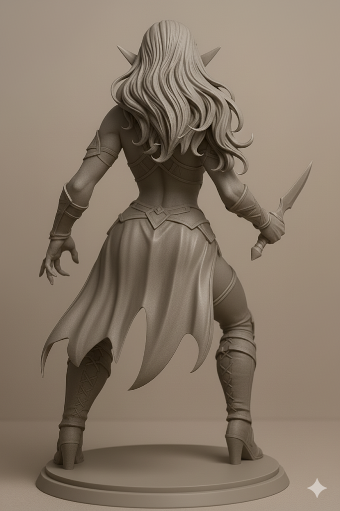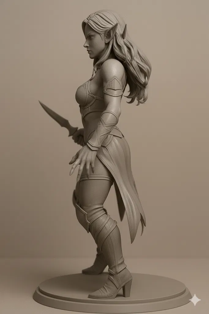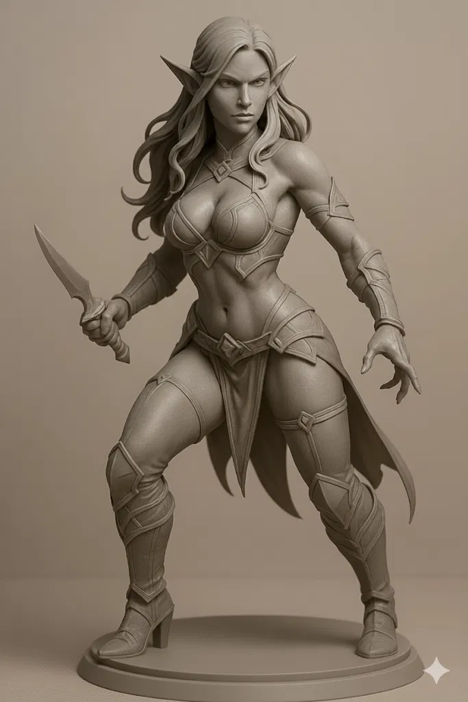 Mô hình in 3D này mang đến hình ảnh Elara, Nữ Tặc Rừng Xanh, một nữ sát thủ tộc tiên hắc ám với những đường nét sắc sảo, mái tóc dài bồng bềnh và đôi tai nhọn đặc trưng. Khoác lên mình bộ trang phục giả tưởng đầy phong cách, cô nàng nắm chặt con dao găm, sẵn sàng ra đòn, toát lên vẻ đẹp vừa thanh lịch vừa nguy hiểm. Được thiết kế như một mô hình paintable chất lượng cao, mẫu này cực kỳ phù hợp cho các nhà sưu tập, người chơi game tabletop và những người đam mê thế giới giả tưởng. Hãy thêm Elara vào bộ sưu tập của bạn để có một món đồ trưng bày ấn tượng hoặc tự tay tô điểm cho cô nàng thêm phần sống động theo phong cách riêng của bạn.
