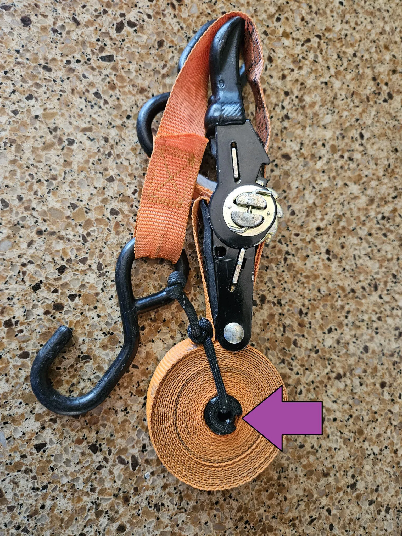 Đây là những dây đai ratcheting bằng webbing giá rẻ 1-in từ Home Depot (thương hiệu HDX nếu tôi nhớ không nhầm). Các đầu dây lỏng đang bị rối trong các hộp đạn của tôi. Việc các dây bị rối tạo ra một lý do tốt để không buộc chặt hàng hóa trong thùng xe tải. Điều đó không phải là một ý tưởng hay.