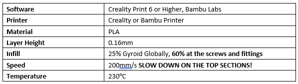 File 3MF đi kèm đã được cài đặt độ đặc ruột phù hợp. Nếu bạn in từ các file STL, hãy tăng độ đặc ruột lên 25% với hoa văn gyroid. Đối với các đầu có ốc và phụ kiện, hãy áp dụng bộ điều chỉnh và tăng độ đặc ruột lên 60%.