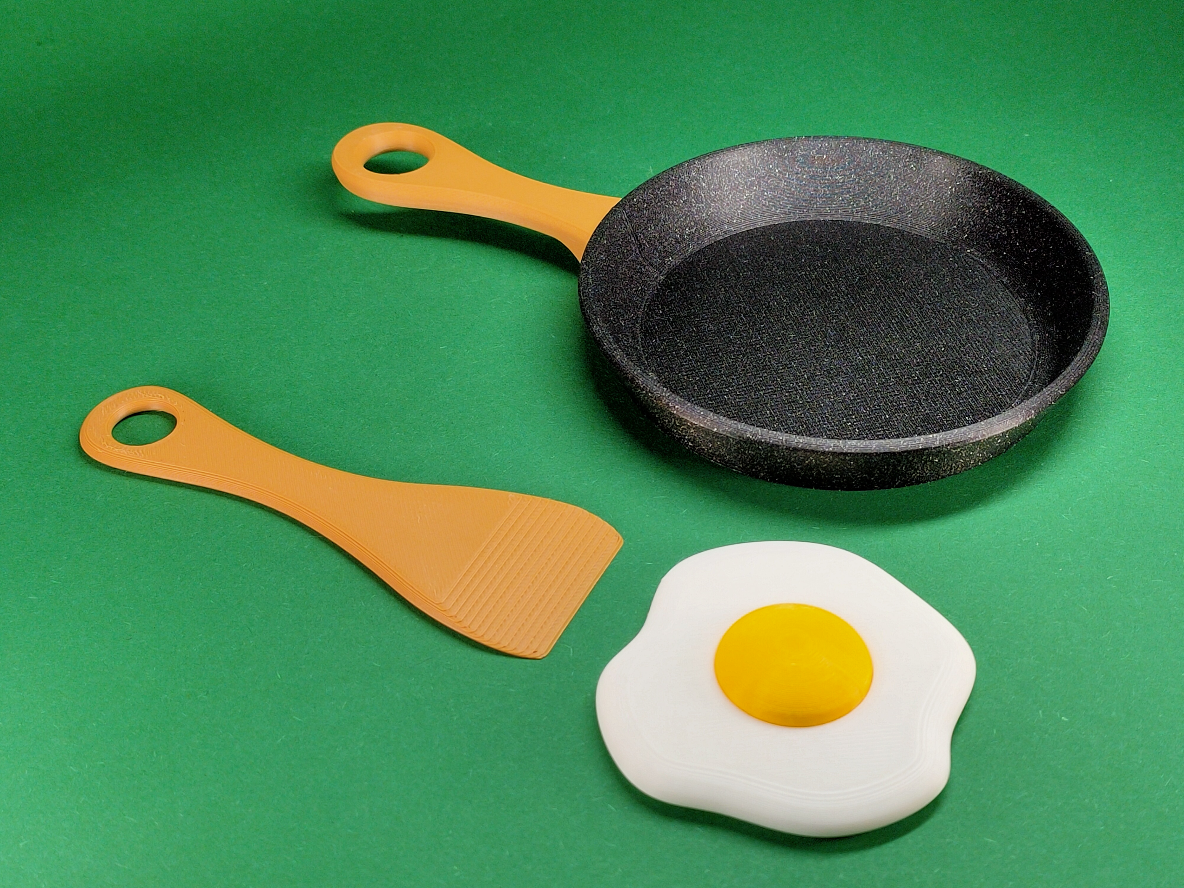 Mô hình 3D chi tiết 'Trứng Ốp La Trong Chảo' kèm muỗng gỗ, màu sắc chân thực như thật. Kích thước chảo khoảng 90mm, hoàn hảo cho đồ chơi nhà bếp của trẻ em. In bằng PLA và PETG.