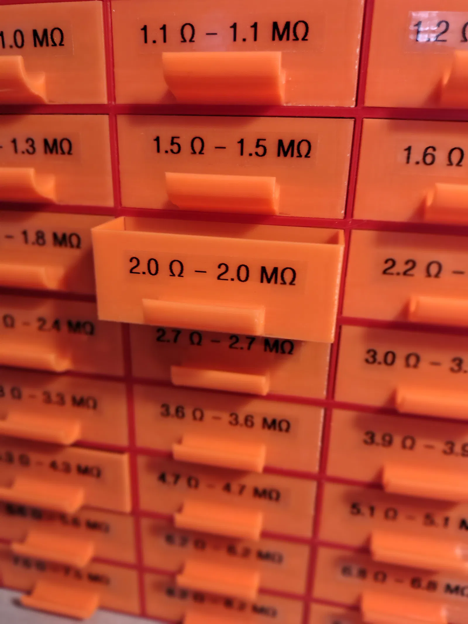 - 24 ngăn kéo, mỗi ngăn có 7 khoang. Cái này phù hợp với dòng điện trở E24 đầy đủ (từ 0,1 Ohm đến 9,1 MOhm).