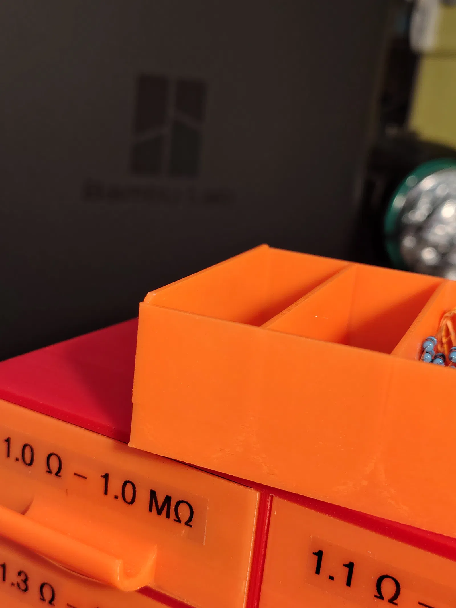 Bộ lưu trữ điện trở gồm 24 ngăn kéo, mỗi ngăn có 7 khoang, phù hợp với dòng E24. Thiết kế chống đổ, dễ dàng lấy từng linh kiện, tối ưu hóa không gian và tiết kiệm vật liệu in. Hỗ trợ in một mảnh trên P1S.