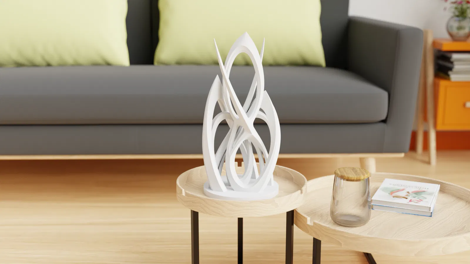 Thiết kế gợi lên nhiều yếu tố tự nhiên—từ điệu múa duyên dáng của ngọn lửa đến sự xoắn nhẹ của những dải ruy băng bị gió cuốn đi. Lớp hoàn thiện màu trắng tối giản làm nổi bật sự tương tác giữa ánh sáng và bóng tối trên bề mặt của nó, tạo nên một điểm nhấn ấn tượng và tinh tế cho bất kỳ không gian hiện đại nào.