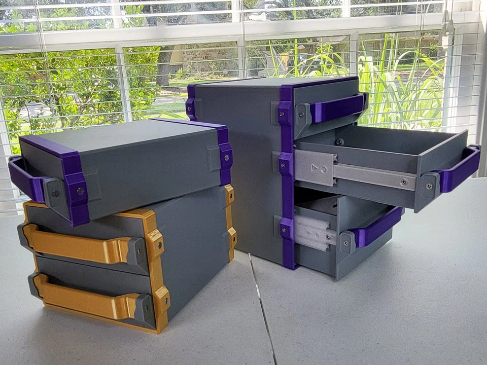 Tủ được làm từ 3 bộ phận: một tấm đế, một bộ phận vỏ và một nắp trước. Có một số biến thể tủ đi kèm yêu cầu số lượng và kích cỡ ngăn kéo khác nhau. Chúng sẽ có định dạng tên file là <grid_width>x<grid_height>_<sizes>_<Backplate|FrontCap|Housing>.stl.