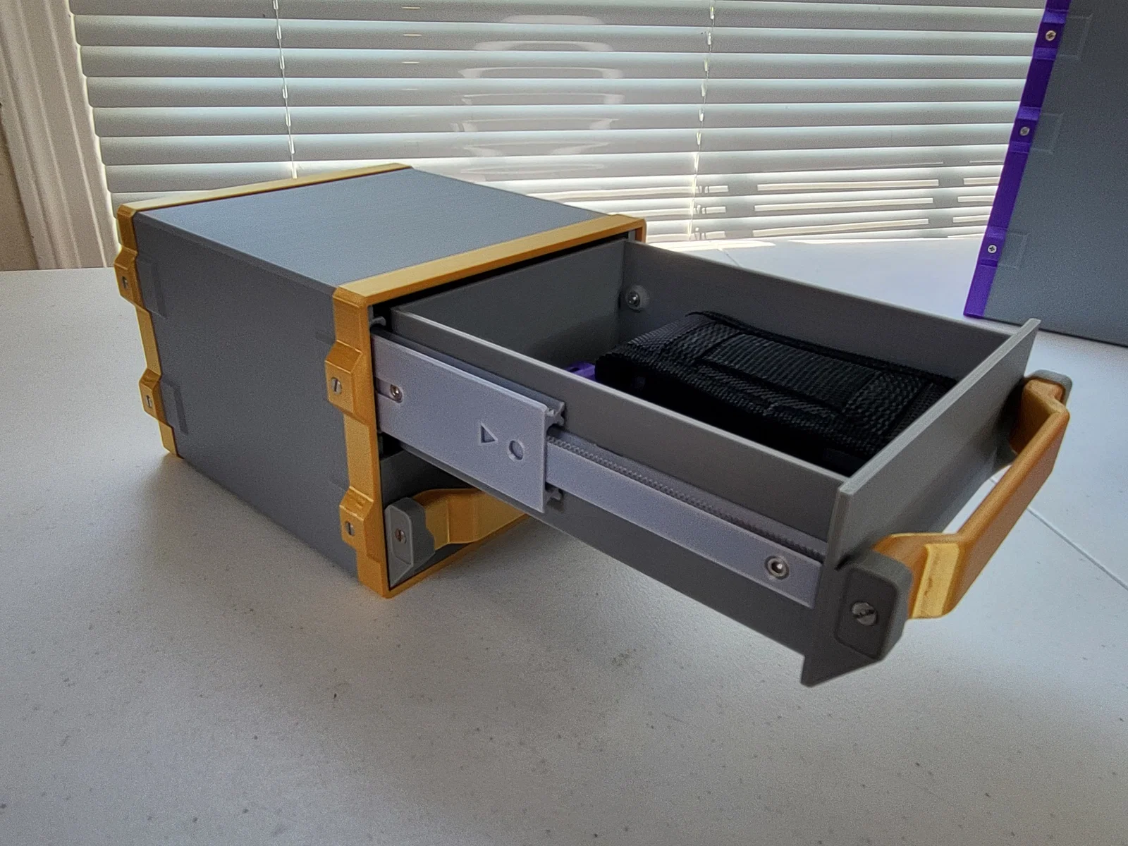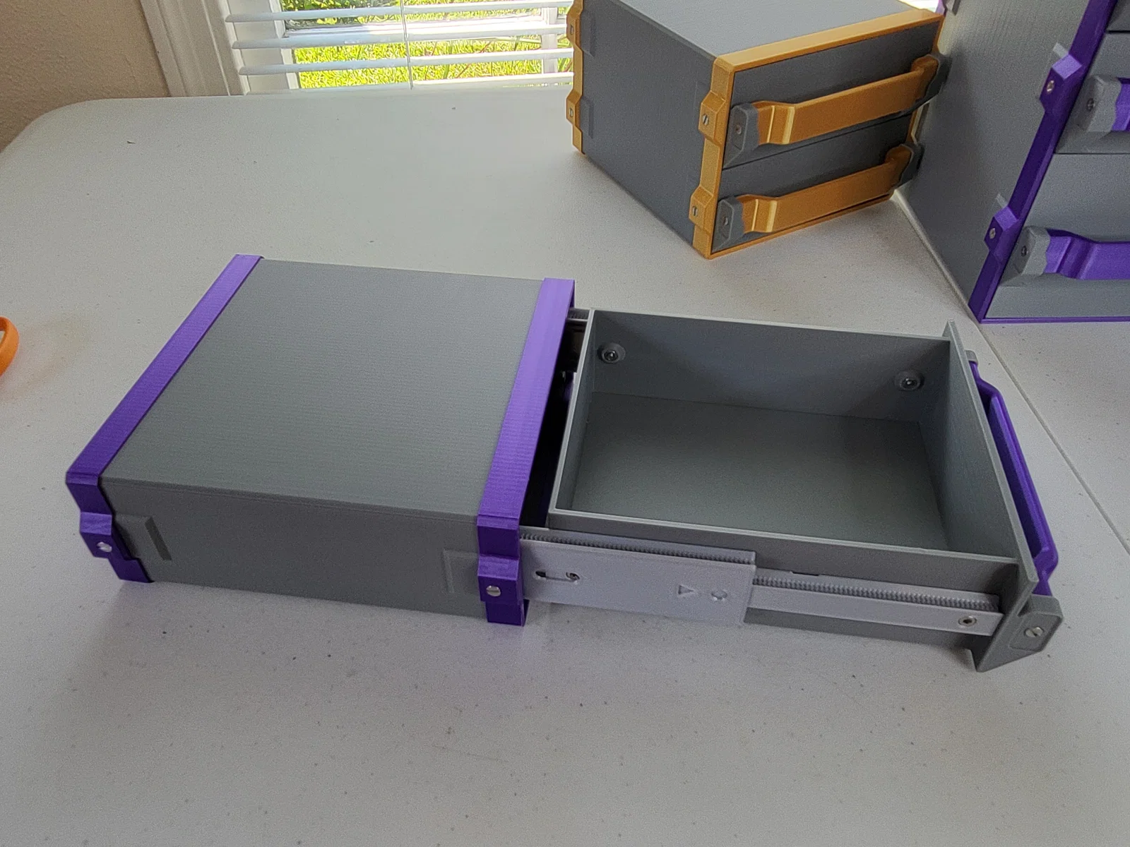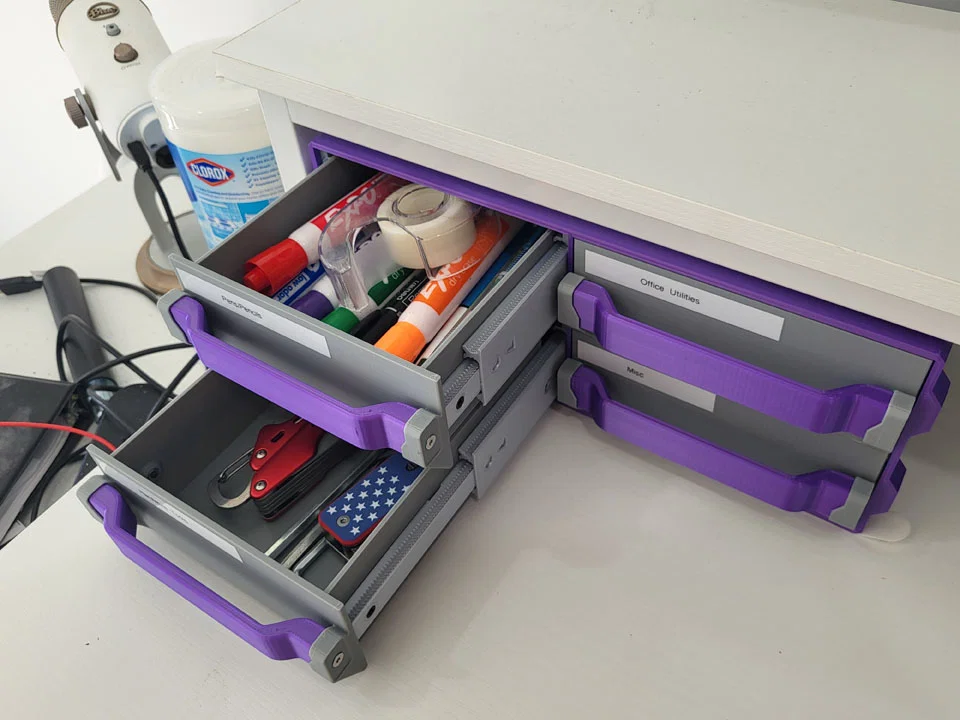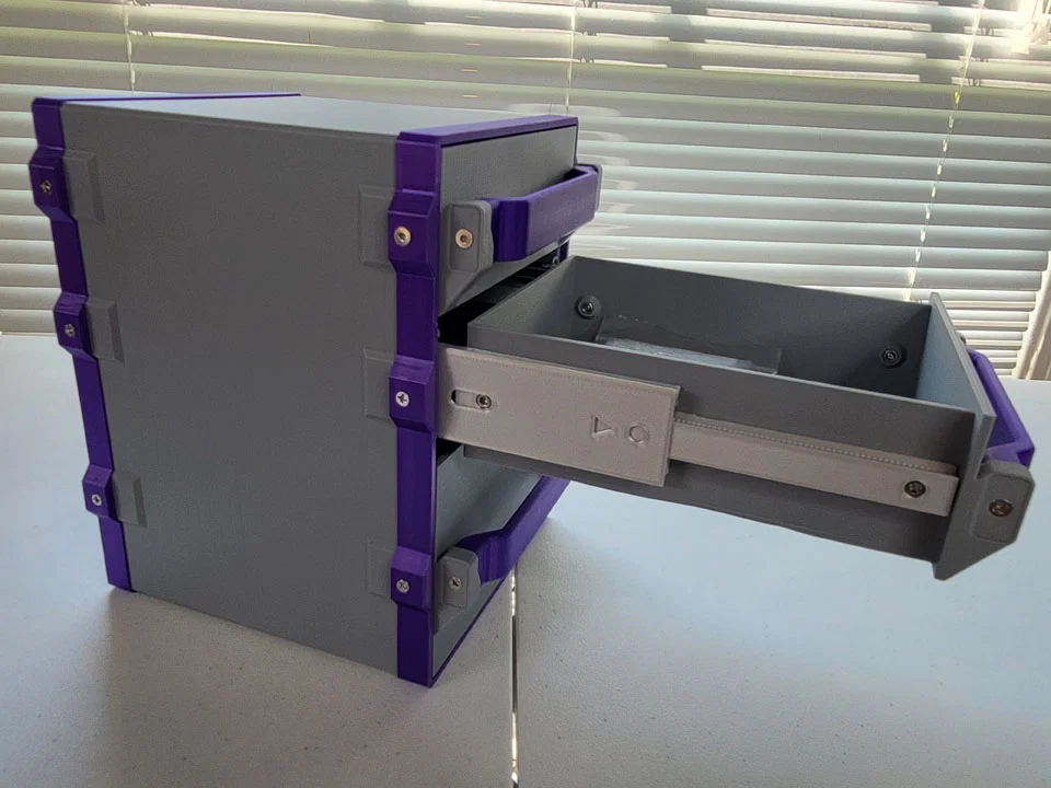 Đây là một hệ thống ngăn kéo ngăn không cho ngăn kéo bị rơi ra hoàn toàn, nhưng vẫn có thể kéo ra hết cỡ khỏi tủ nhờ cơ chế thanh trượt tuyến tính dạng lồng (telescoping). Nó hoạt động giống như một cơ chế ray trượt, tương tự như ngăn kéo tủ đồ nghề hoặc tủ hồ sơ, nhưng các ray trượt hoàn toàn được in 3D thay vì làm từ kim loại gấp và sử dụng vòng bi. Lưu ý là mặc dù các ray trượt tuyến tính hoàn toàn được in 3D, dự án này vẫn dùng khá nhiều ốc M3.