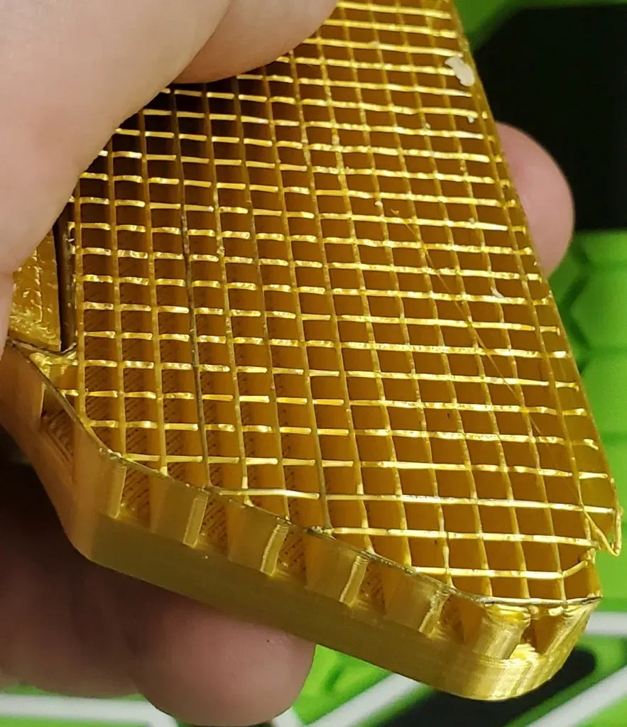Khi tôi in, tôi đã sử dụng giá đỡ từ dưới lên. Nếu tôi nhớ đúng, tôi sẽ chụp một bức ảnh của tay cầm bên phải trước khi tôi gỡ bỏ giá đỡ. In chúng với các hình lục giác hướng lên.