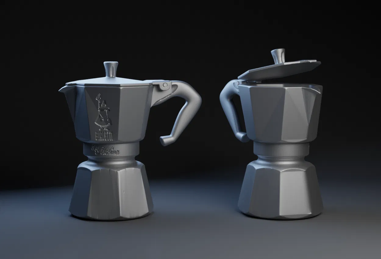 Mô hình 3D chi tiết của bình pha cà phê Bialetti Moca, phiên bản "Play". Thích hợp cho các dự án mô hình hóa 3D liên quan đến bếp núc, pha chế cà phê hoặc sưu tập.