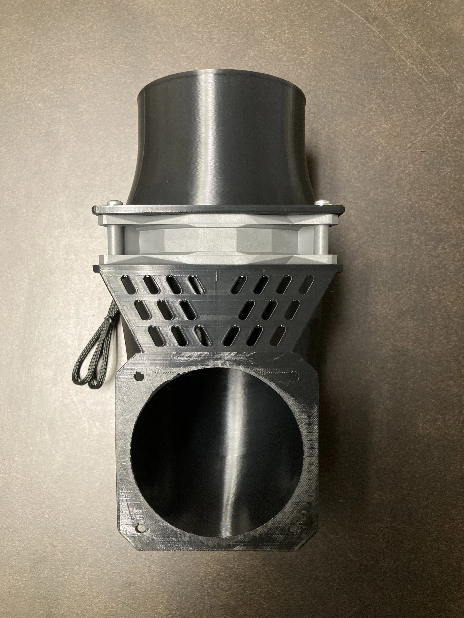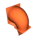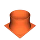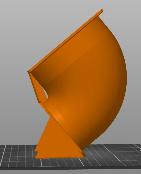 Hướng in - Bạn sẽ cần định hướng lại mô hình góc 90 độ lớn hơn để nó nằm trên các chân đỡ đã được mô phỏng. Điều này đặt mặt bích nhỏ hơn ở góc 50 độ so với bàn in, và cho phép bạn in toàn bộ mô hình chỉ với một chút hỗ trợ ở vòm trên của lỗ nhỏ hơn. Đặt ngưỡng nhô ra là 30 trong slicer và đặt các khối chặn hỗ trợ trên đỉnh của tất cả các lỗ trên cả hai mặt bích và bộ phận kết nối giữa các mặt bích. Bộ phận kết nối này được sử dụng để tránh cần hỗ trợ có thể phá vỡ cho mặt bích lớn hơn. Bộ phận nối quạt 120mm với ống 4" được in phẳng trên bề mặt mặt bích của nó.