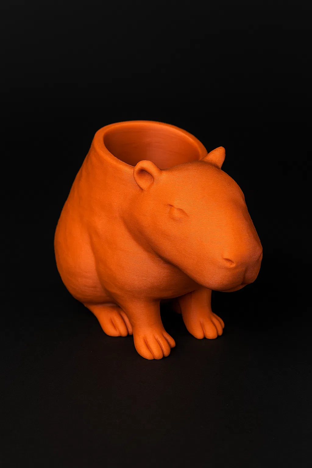 Một chiếc kệ cắm bút hình capybara dễ thương và chân thực. Phần trên khoét rỗng hoàn hảo để đựng bút chì, cọ vẽ hoặc các dụng cụ nhỏ. Vừa trang trí vừa tiện dụng, mang đến sự vui tươi cho bàn làm việc của bạn.