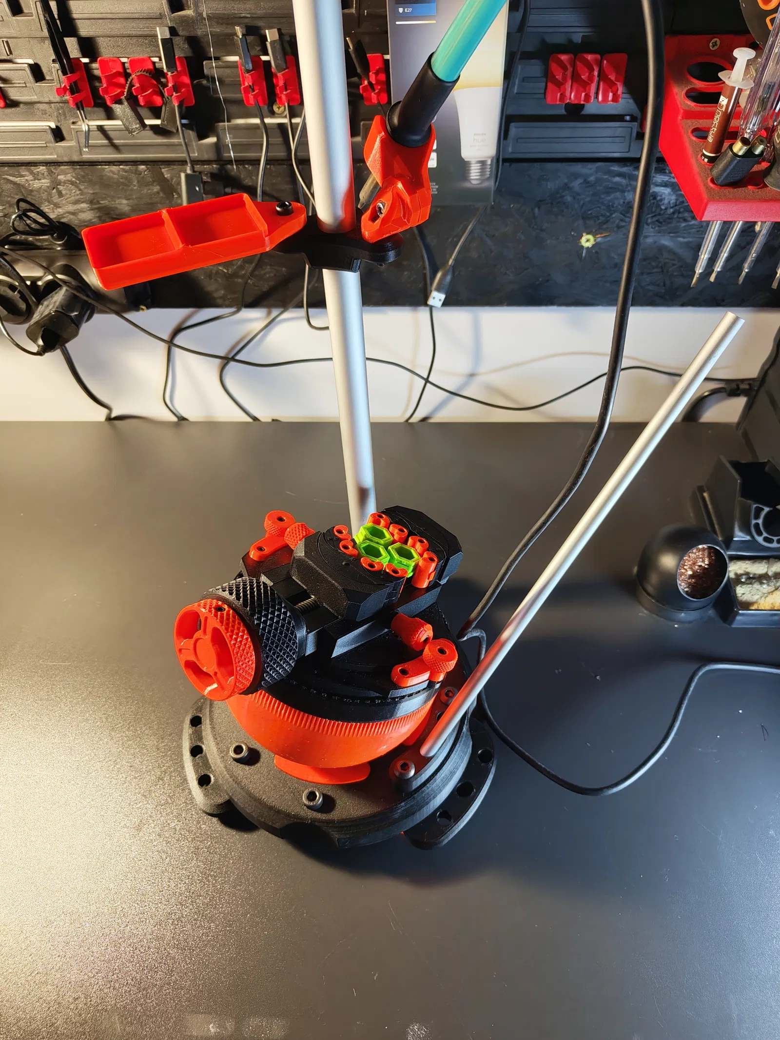 Có giá đỡ mỏ hàn ở phía sau có thể giữ mỏ hàn 20mm. Kệ lưới gridfinity đã được thay đổi để dùng bu lông M5.