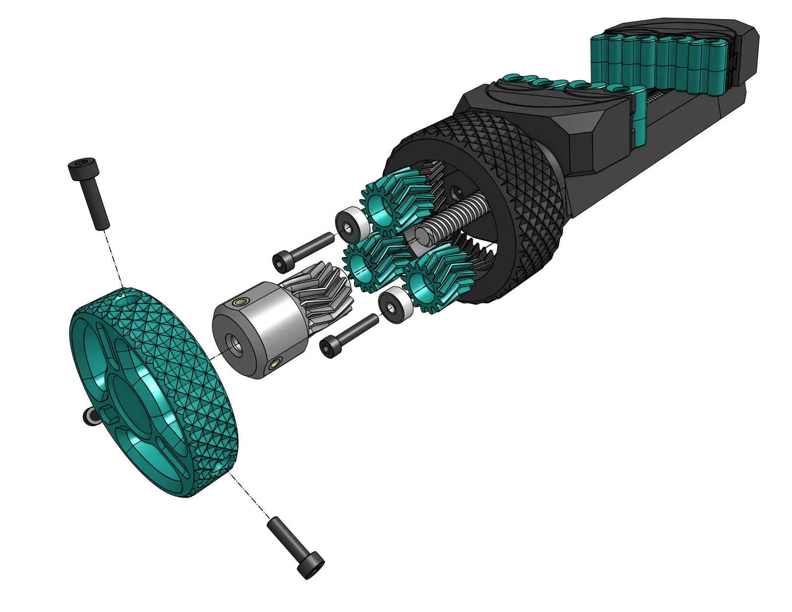 Cái này hay nè, cho phép bạn kẹp hàm với tỉ số truyền 3:1 hoặc 1:1 bằng cách sử dụng bánh xe này hoặc bánh xe kia. Lại có thể dùng mỡ ở đây. Khó in - xem hướng dẫn nha. TUYỆT ĐỐI KHÔNG siết quá chặt bu lông M3 đi vào vòng bi.