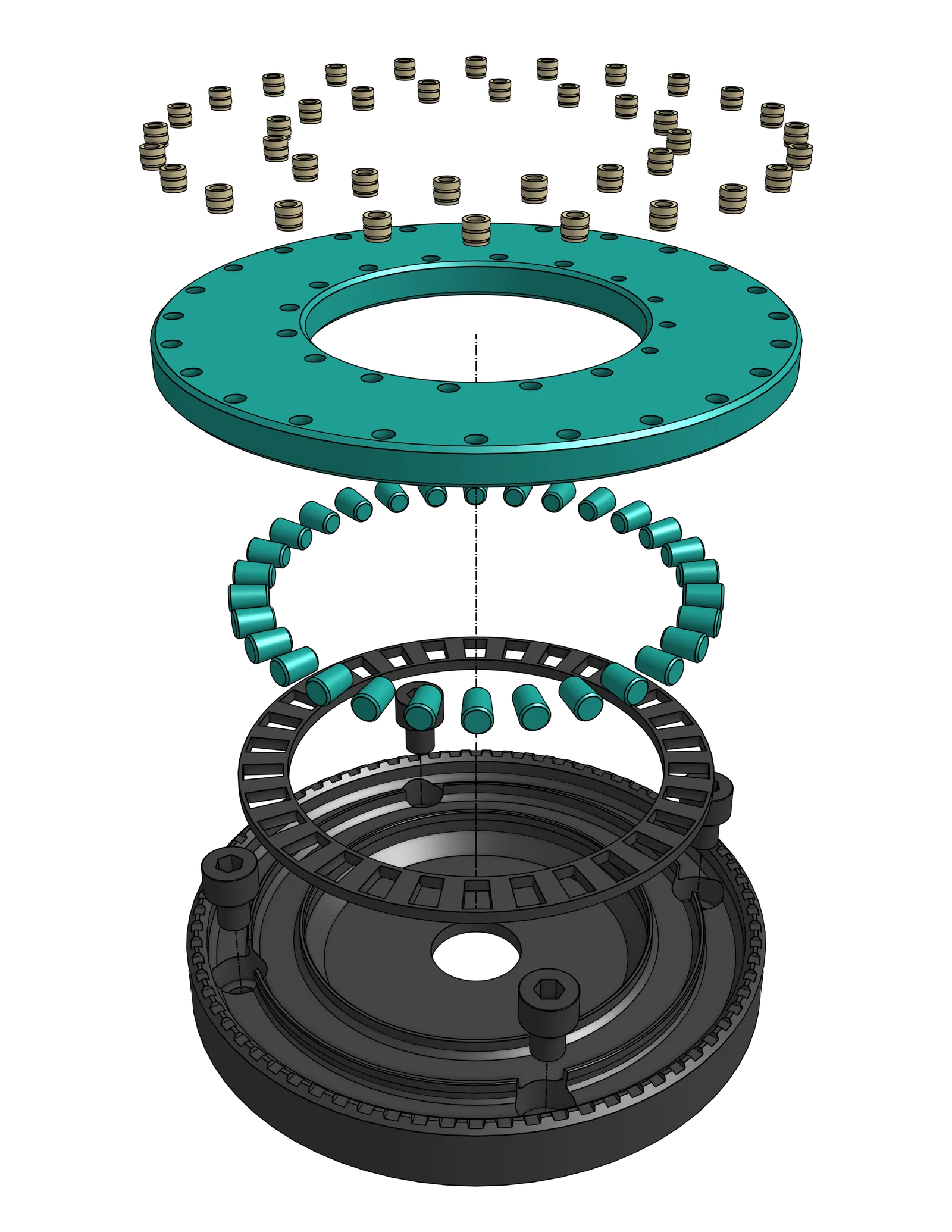 Bộ bánh răng hành tinh phải được in trong một lần in vì các bánh răng hình xương cá sẽ không lắp ráp được sau đó.