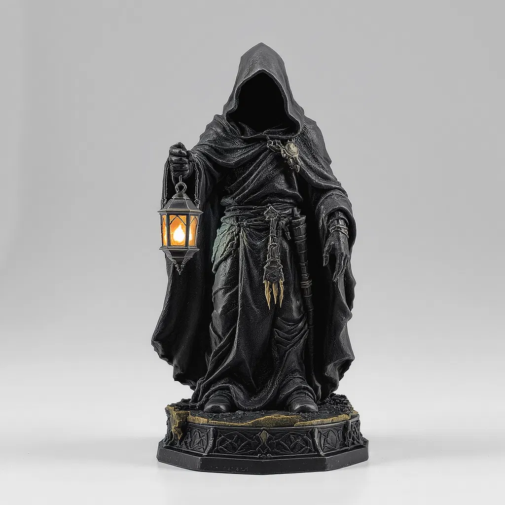 Tượng nhỏ gọn hình dáng một crypt keeper trùm mũ đang cầm đèn lồng, tất cả chi tiết được gắn kết chặt chẽ. Tỷ lệ dày, tượng in một khối.