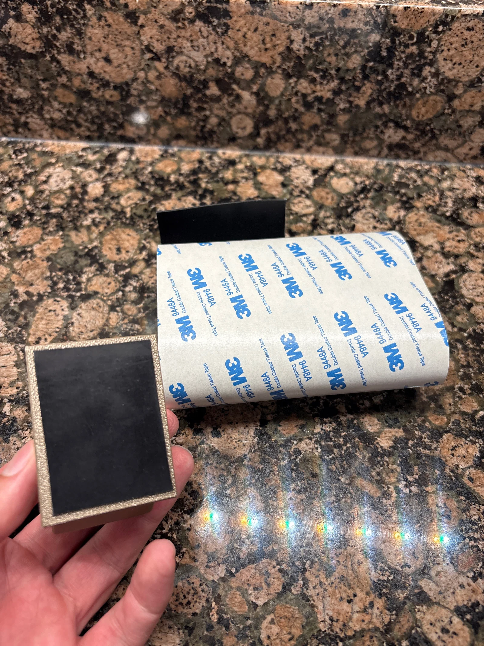 tacokittah có gợi ý là dán băng keo hai mặt ở dưới đế khi bạn dán nhãn. Tui có sẵn mấy miếng đệm silicon 3m cho đồ nội thất mà tui mua trên Amazon nên tui dán mấy miếng đó vô đế và giờ thì nó dính gần như mọi bề mặt mà tui đặt lên.
