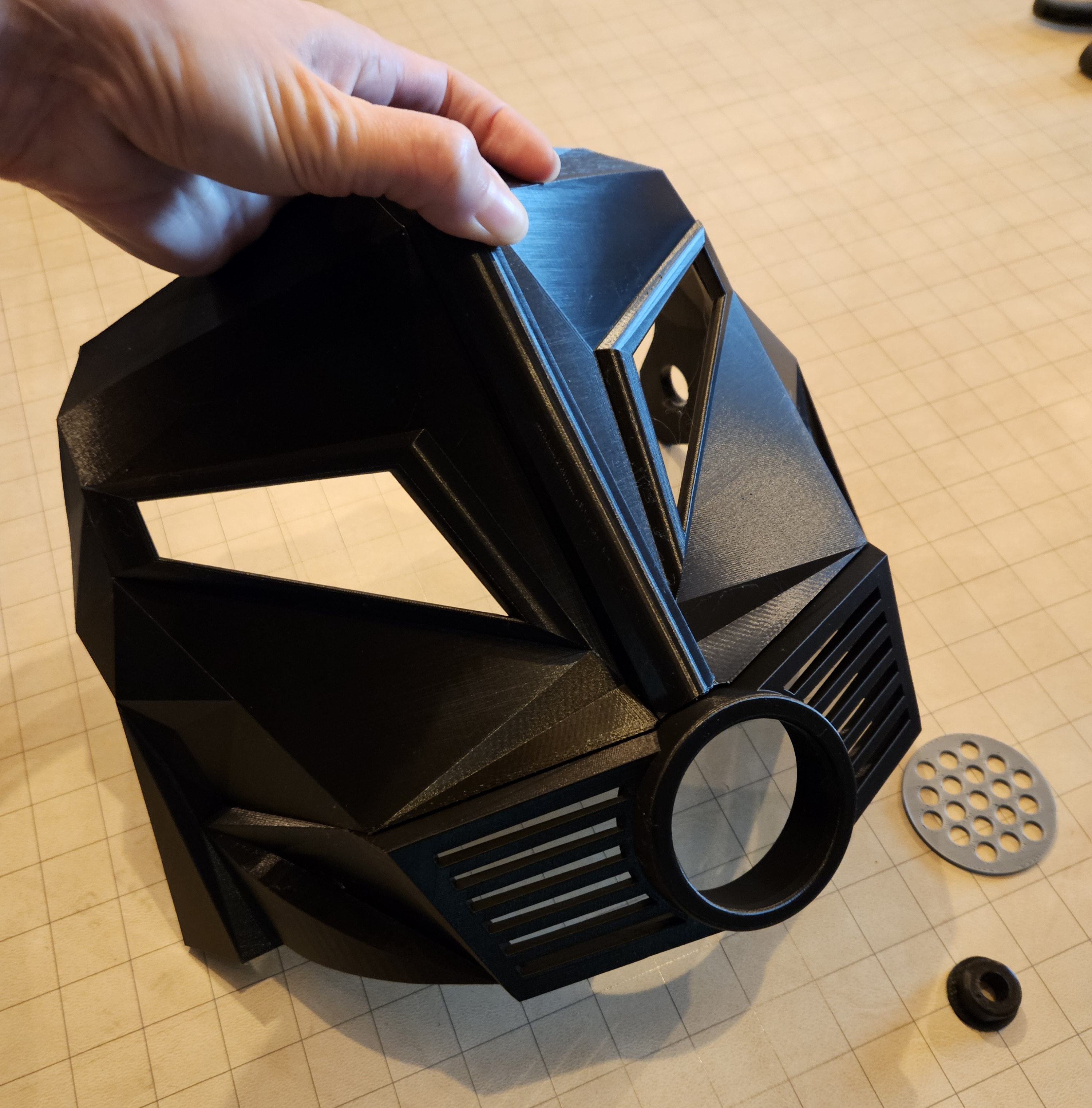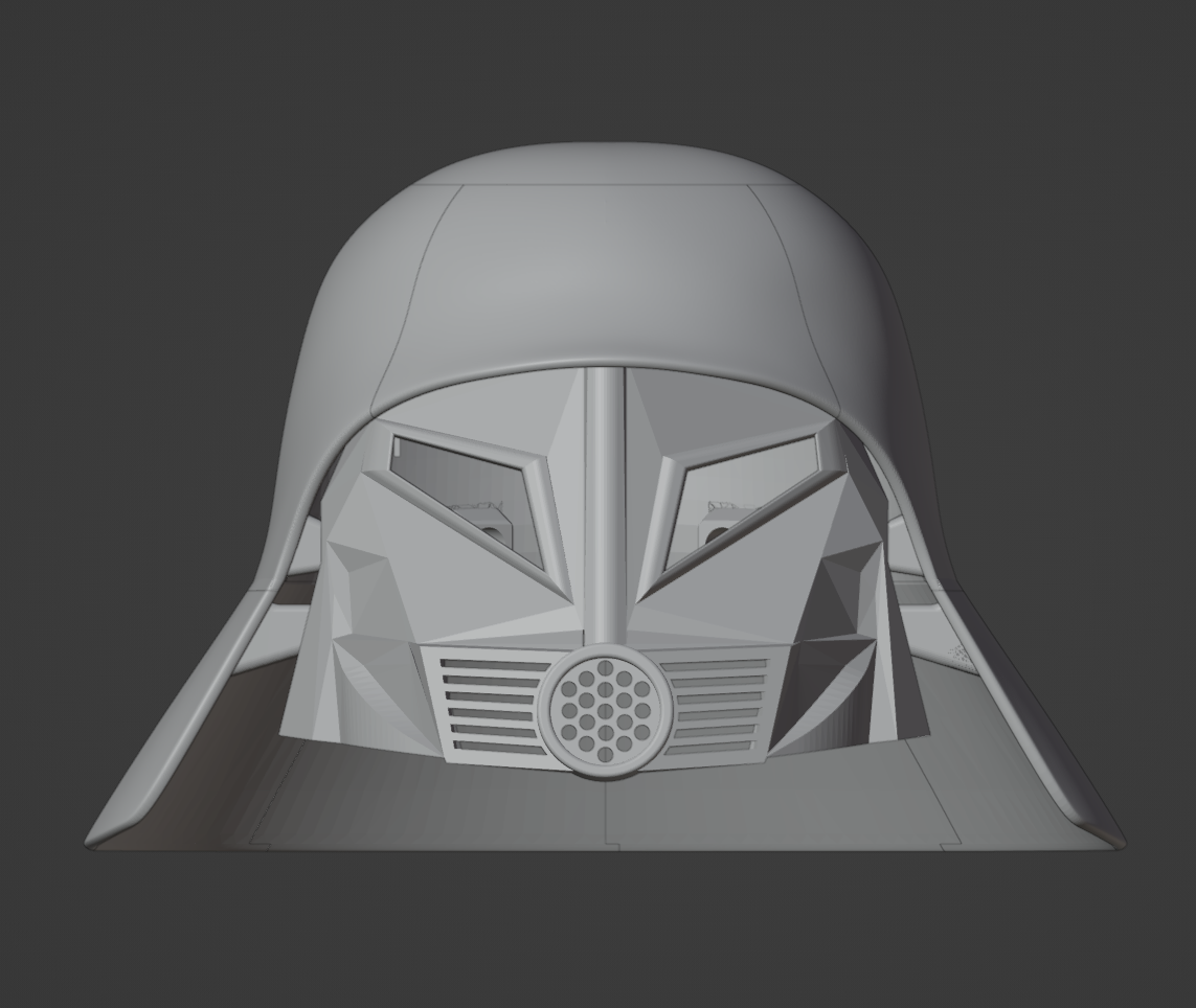 Đang làm bộ đồ Dark Helmet mà thấy mấy cái file trên mạng hông có ưng ý. Ban đầu tính mod lại thôi, mà phải bỏ hết cái cũ đi làm lại từ đầu. Mặt nạ của mẫu này lấy cảm hứng nhiều từ bản làm bằng giấy (pepakura) của Darkside501st, mà nếu không thử mod lại mẫu Dark Helmet của MoeSizzlac (https://www.thingiverse.com/thing:2988430) thì tui cũng hông biết tới nó luôn. Xin ghi công mấy anh đi trước đã đặt nền móng. Nhờ mấy cái đó tui mới nắm được tỉ lệ và hình dáng. Xem cái này như là nghiên cứu của thầy đi ha.