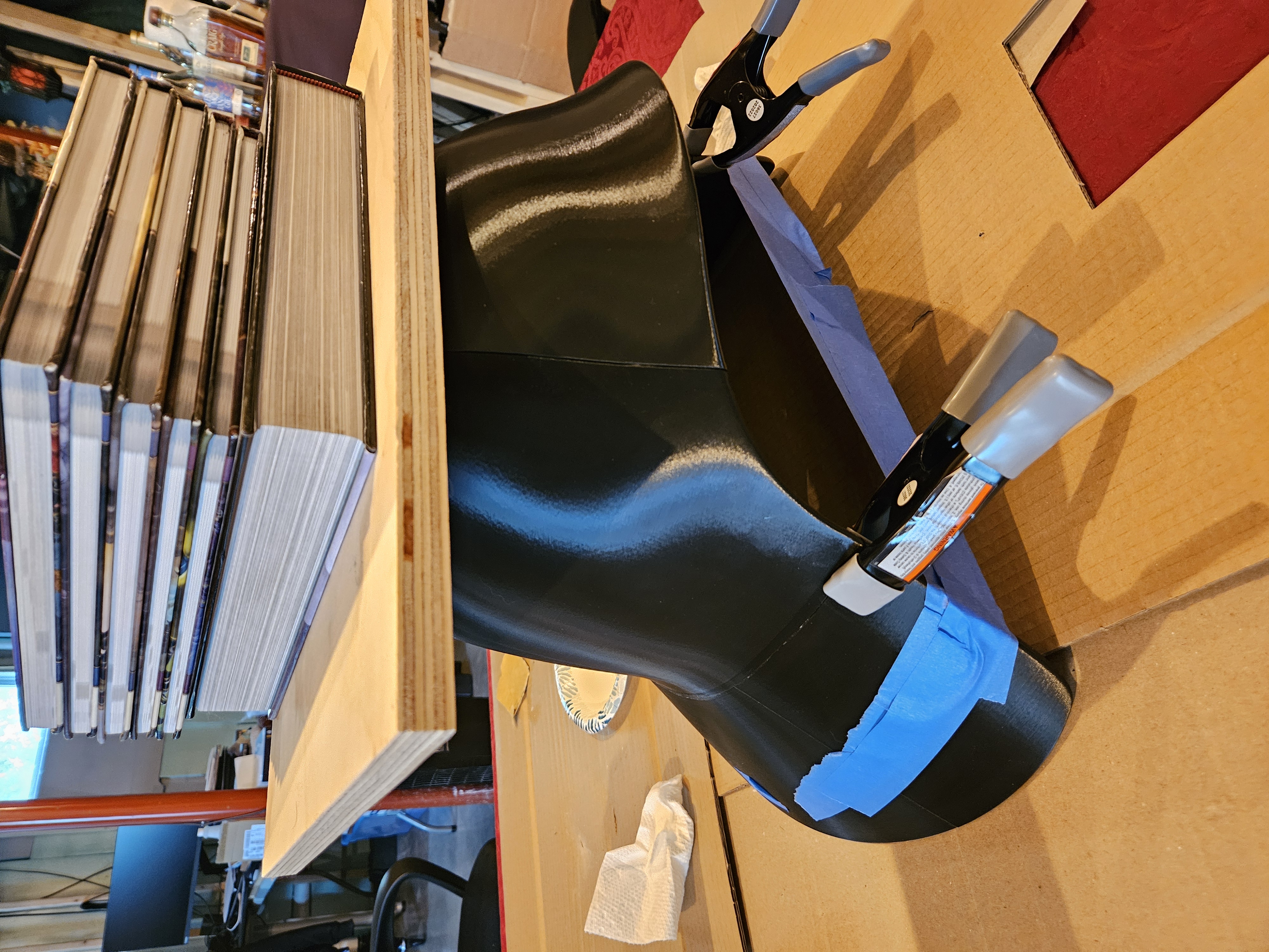 - Gắn phần trên vào vành. Bạn có thể kẹp ở phía trước, nhưng sẽ cần phải đè phần trên xuống (đó là lý do chưa gắn vòm) để dán tốt. Một tấm ván và chồng sách là đủ.