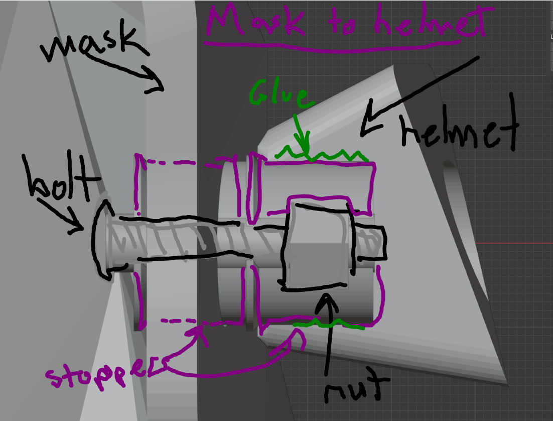 - Mặt nạ gắn vào mũ bảo hiểm qua các lỗ 20mm lớn. Tui có đăng các bộ phận gắn của tui và một sơ đồ giả. Giải pháp của tui là có một cái đai ốc lục giác được nhét vào một hình trụ, rồi dán vào các khe của mũ bảo hiểm. Mặt nạ sau đó có thể được gắn bằng cách vặn nó vào vị trí. Các miếng đệm cho phép mặt nạ di chuyển tự do.
