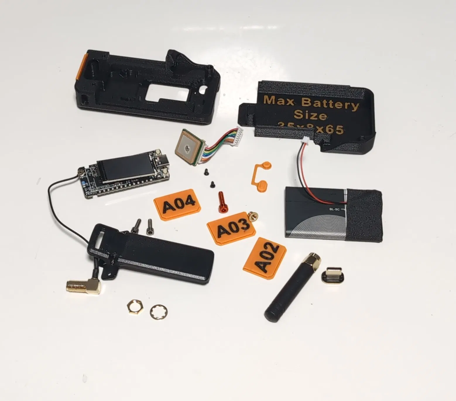 Ở dưới là tất cả các bộ phận được sắp xếp, mình đã tăng kích thước khoang pin, giờ hỗ trợ pin lớn tới 8mm x 35mm x 65mm. Mình đang xài pin BL5C, loại này từng xài cho điện thoại Nokia đời cũ với các thiết bị khác, chúng có hệ thống quản lý tích hợp sẵn chống sạc quá tải và sẽ tự ngắt trước khi thiết bị bị sập nguồn rồi treo, cái này hay lắm nếu bạn muốn gắn sạc năng lượng mặt trời, và loại pin này xài được hơn 24 tiếng, nhưng bạn có thể xài pin lớn hơn nhiều để có thời gian sử dụng lâu hơn.