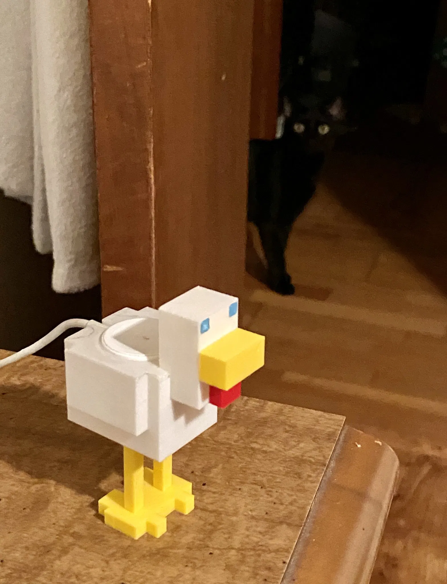 Tôi đã tìm thấy các mẫu cơ bản trên minifactory của Mariusz Leśniak (https://www.myminifactory.com/users/Lesiu), phóng to chúng và thêm lỗ sạc. Đối với con gà, tôi đã phá đầu thành một vài mảnh để mào có thể được in bằng một màu khác ("mỏ" được thực hiện bằng cách thay đổi filament). Ngoài ra còn có một giá đỡ tùy chọn cho con gà để làm cho nó vững chắc hơn.