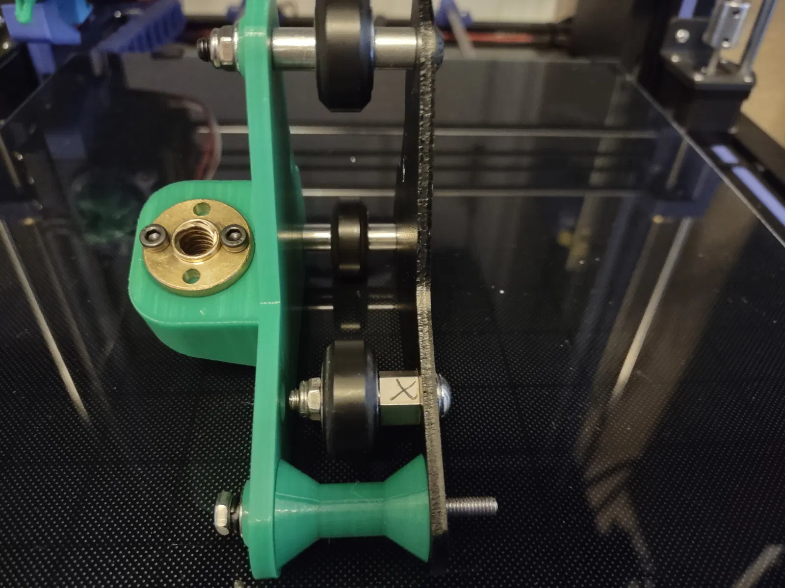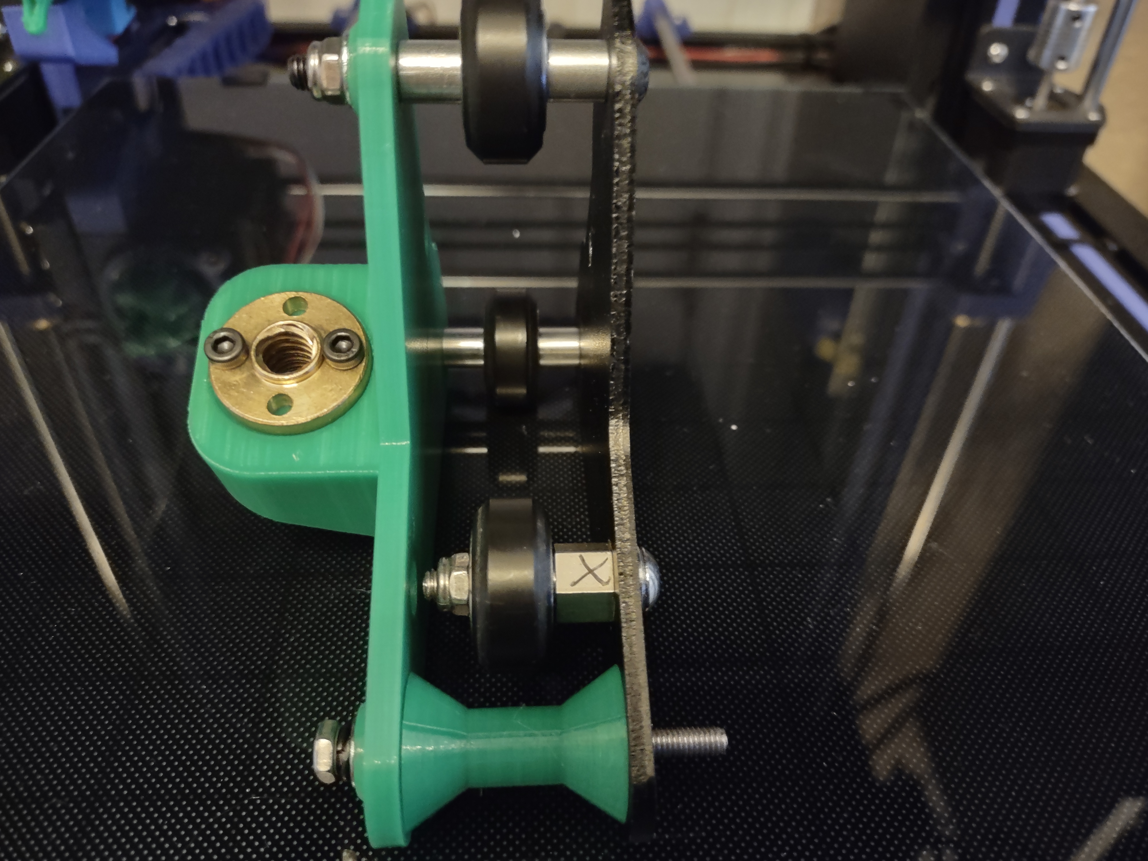 Điểm tôi thích nhất ở thiết kế của ông Egco là ổng gắn vô cái thanh nhôm X bằng con ốc dài và cái miếng đệm, còn cái đai ốc xoay với trục bên phải thì chỉ gắn vô cái tấm ở bên trong thôi. Tôi cũng không rõ tại sao mấy cái kit Dual Z của Creality không làm vậy, cũng không hiểu sao Creality lại bê nguyên cái lỗi thiết kế đó qua cho bên trái máy.
