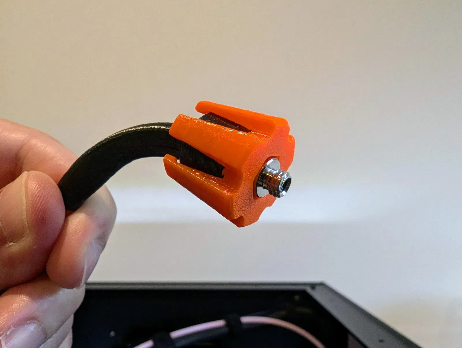 Cái núm này giúp bạn dễ dàng vặn cái fitting của bộ phận bowden ra khỏi Core One Nextruder. Nó được giữ cố định bằng cách kẹp vào đáy của chỗ uốn cong bộ phận bowden. Không cần dùng cờ lê, bề mặt lớn này bạn có thể dễ dàng dùng ngón tay để cầm nắm.