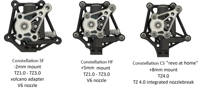 - Constellation SF: Hệ thống lưu lượng tiêu chuẩn, linh hoạt, chi phí thấp sử dụng hotend TZ1.0-3.0, đầu phun V6 và không có bộ mở rộng vùng nóng chảy. Tổng chi phí $15-25.