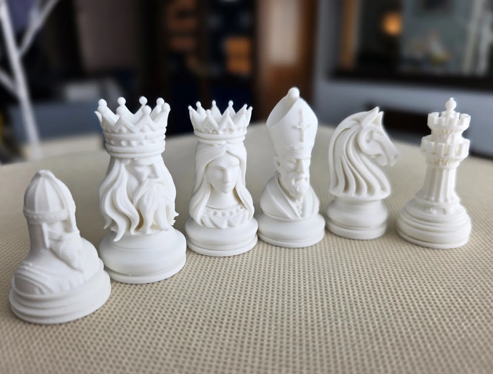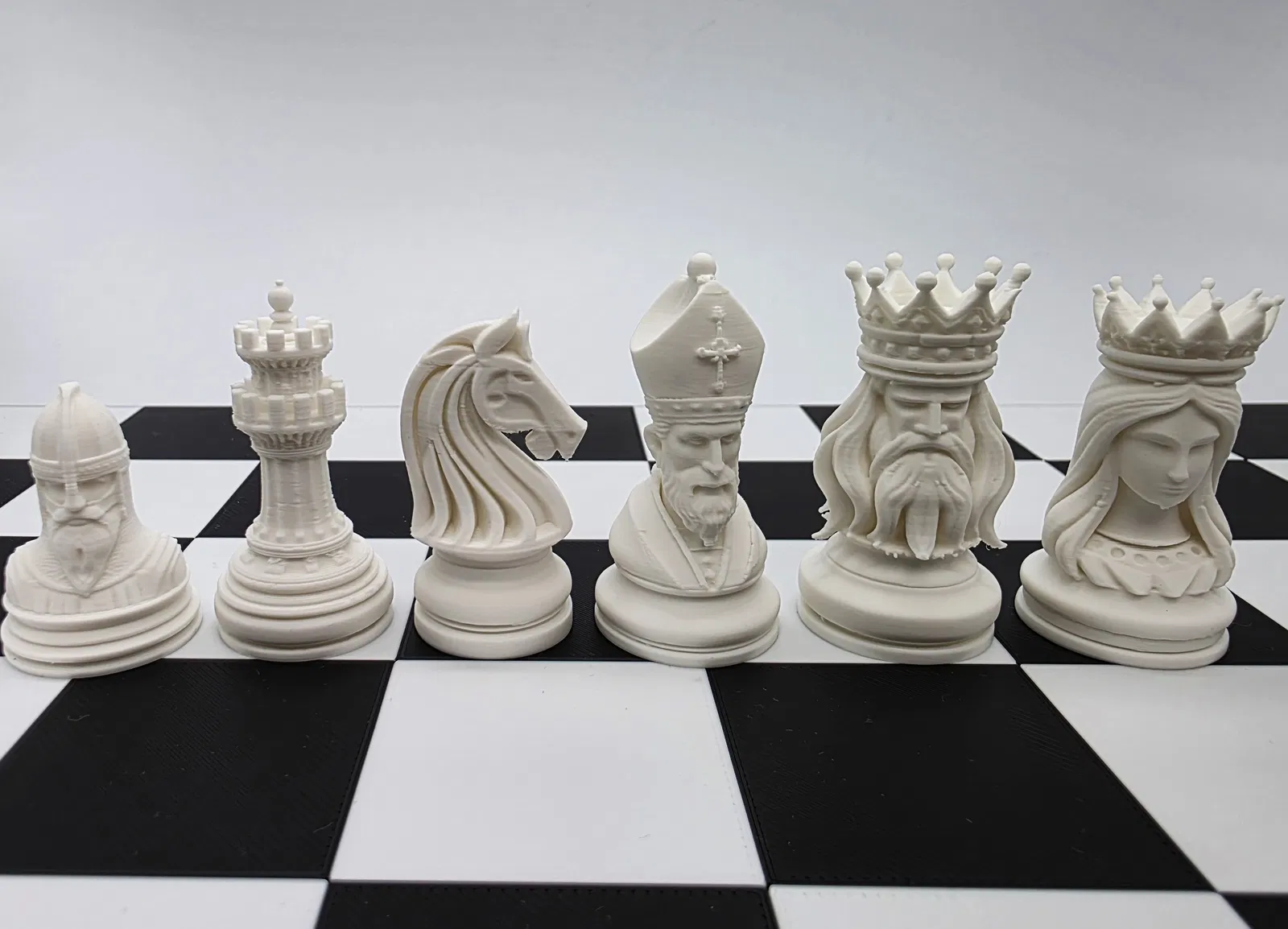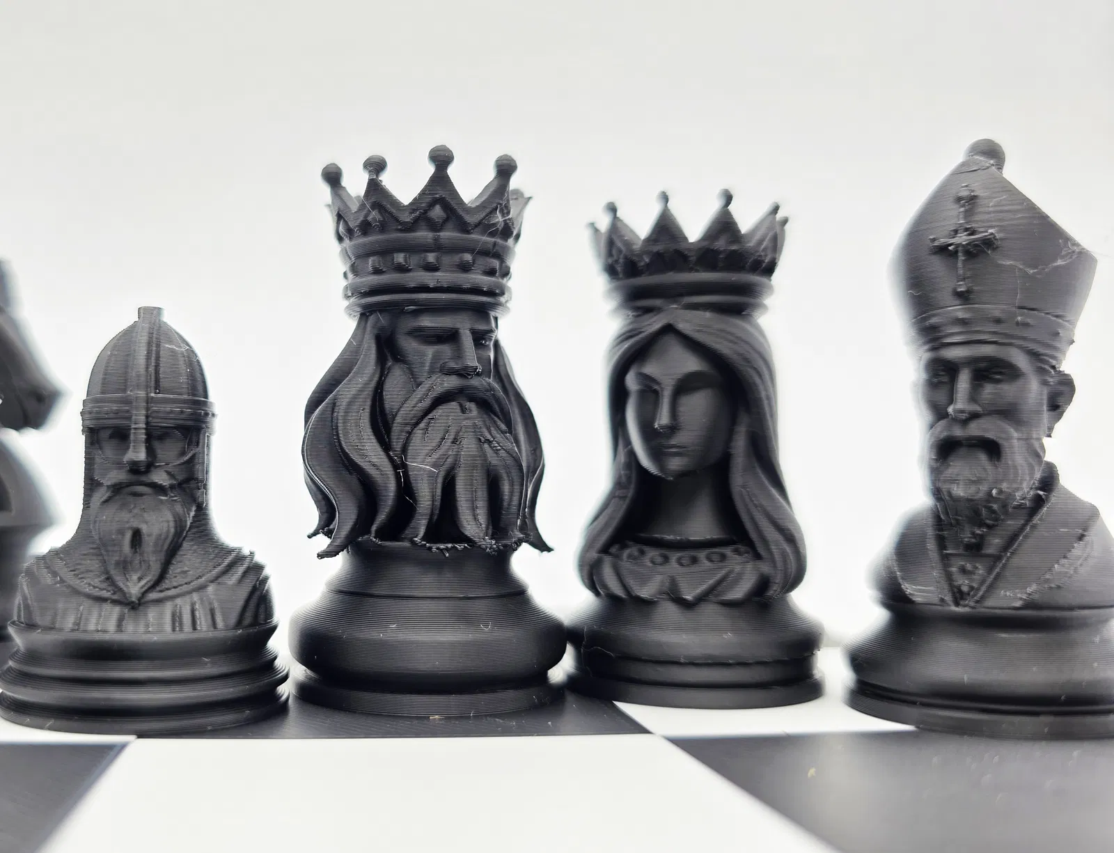Tượng chạm khắc chi tiết cao, có thể thay đổi kích thước, theo chủ đề trung cổ. Bộ quân cờ này mang phong cách điêu khắc độc đáo, như những tác phẩm nghệ thuật. Yêu cầu có bộ đỡ khi in để đạt được chi tiết tốt nhất.