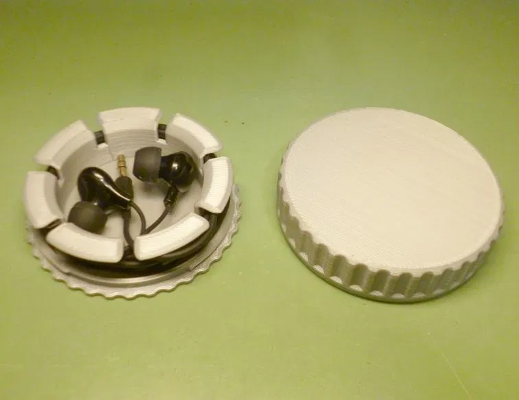 Hộp đựng tai nghe có nắp vặn. Giờ đây có cả file STEP. Chỉ cần xoay 60° là mở được. Kích thước bên trong: đường kính 48 mm, chiều cao 17 mm. Dán hai phần lại với nhau. Có file RSDOC cho DesignSpark Mechanical.
