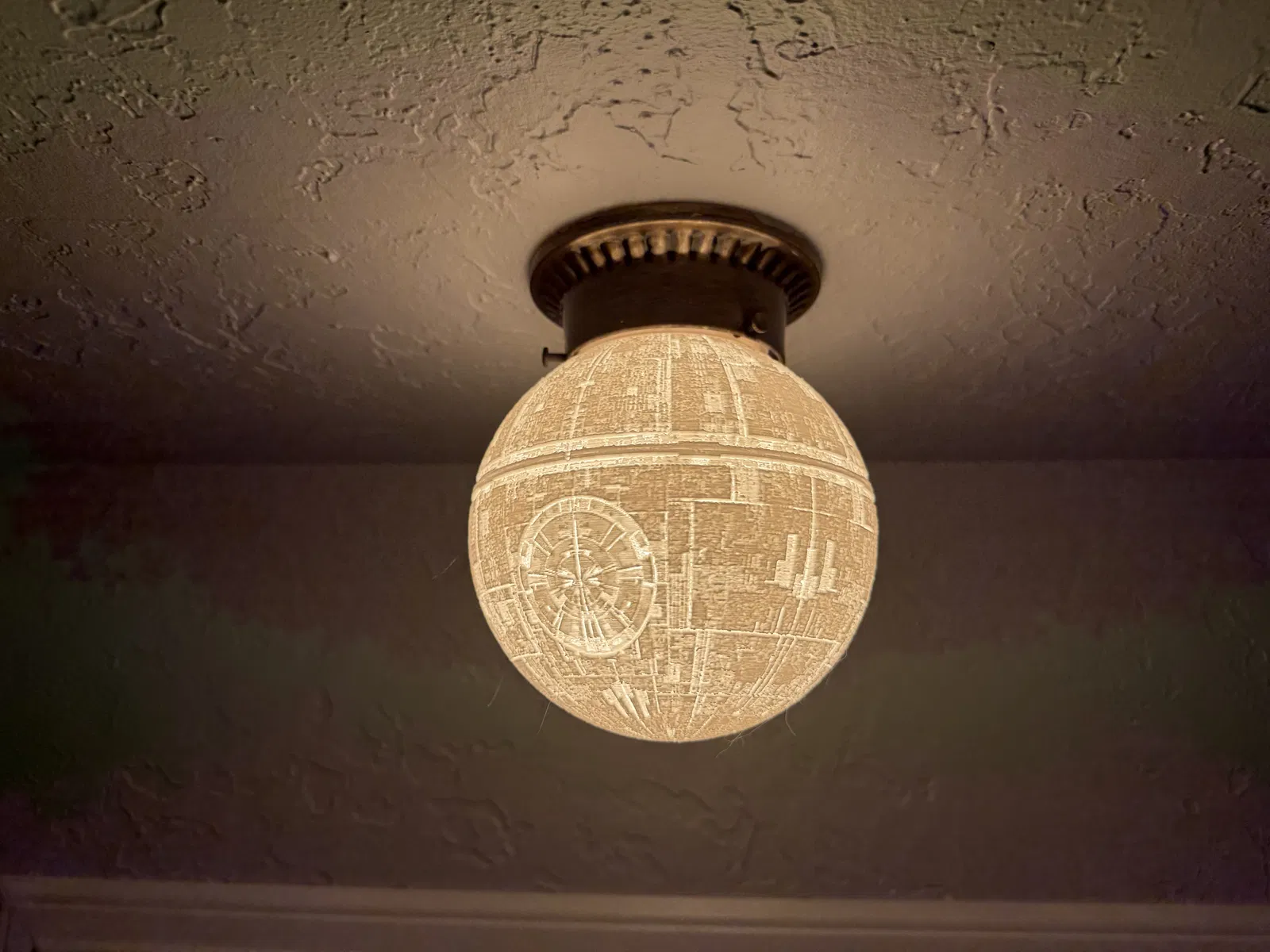 Tui mới làm cái chụp đèn Ngôi Sao Chết cho mấy bộ đèn trần xài cổ 3.25”. Tui thích kiểu nó treo ngược hơn, nhìn "chất" hơn. Có hơi chỉnh sửa chút chi tiết xích đạo cho đẹp. Tui in bằng PETG trắng bằng đầu phun 0.6mm và có support tự động. Lấy support hơi cực nhưng vẫn ổn nha.
