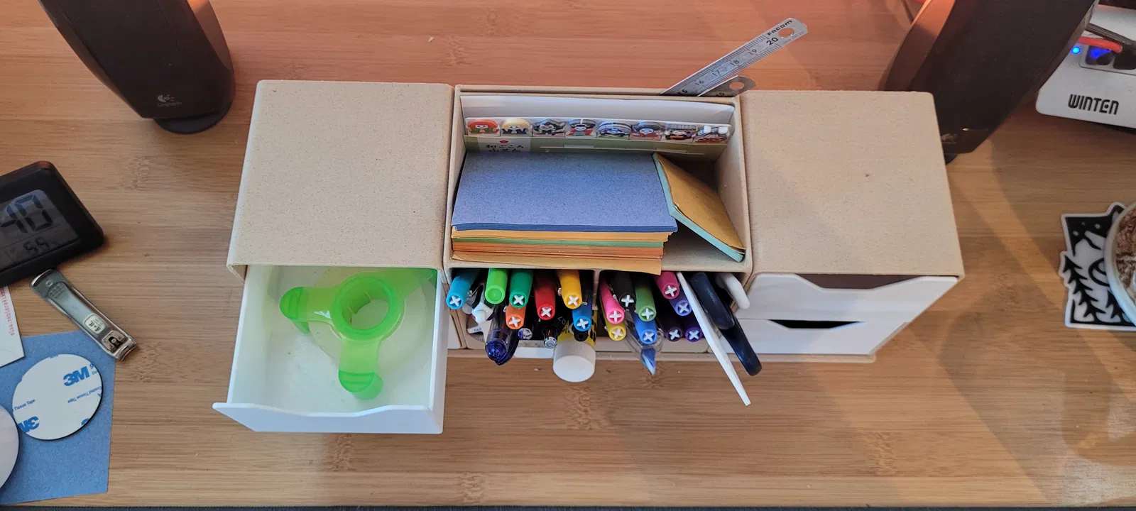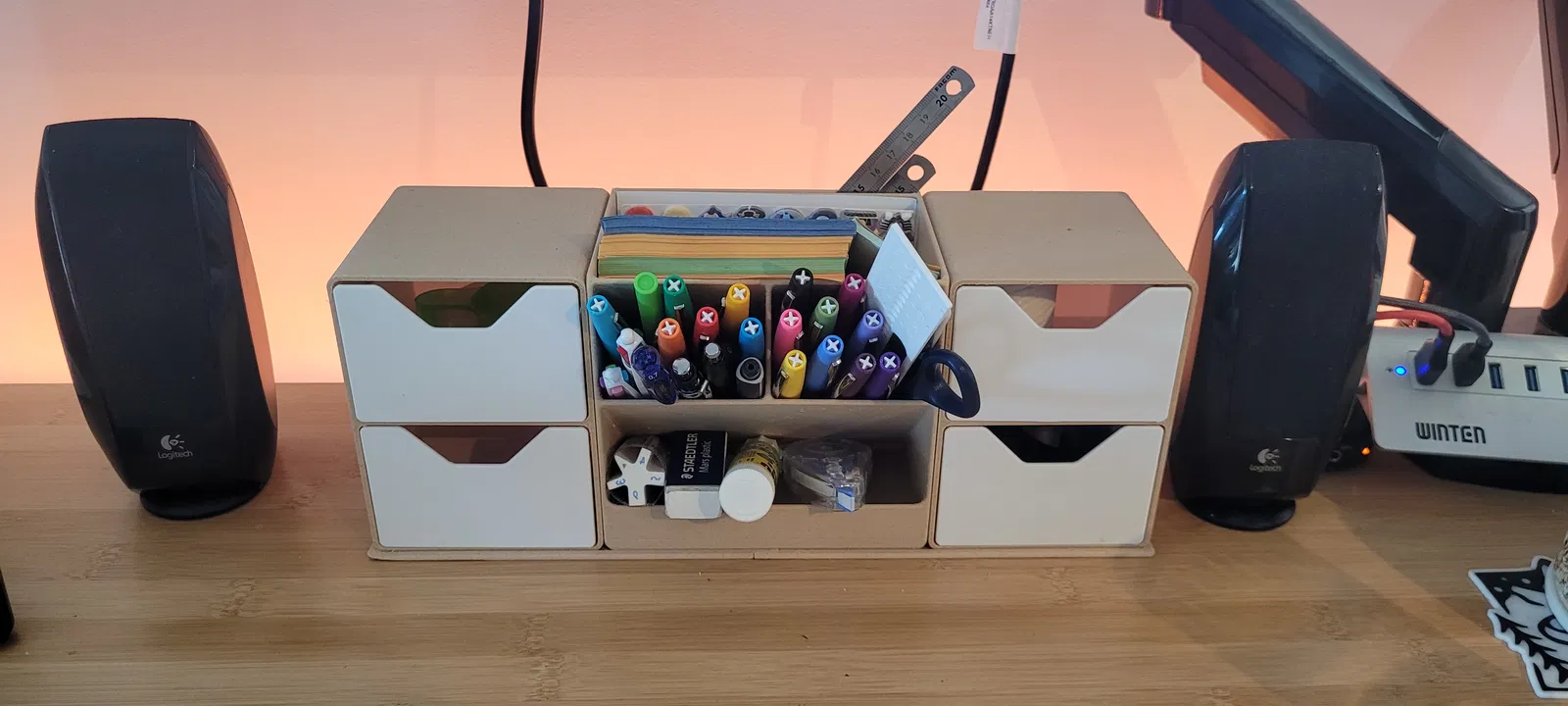 Một ngăn kéo đựng bút, giấy note, thước, gôm và bất cứ thứ gì bạn muốn. Hộp bút kiêm ngăn kéo này vừa tiện dụng, vừa đẹp mắt, giúp bạn cất giữ đồ đạc gọn gàng. Thiết kế nhỏ gọn nhưng rộng rãi, có thể để vừa nhiều vật dụng cá nhân.