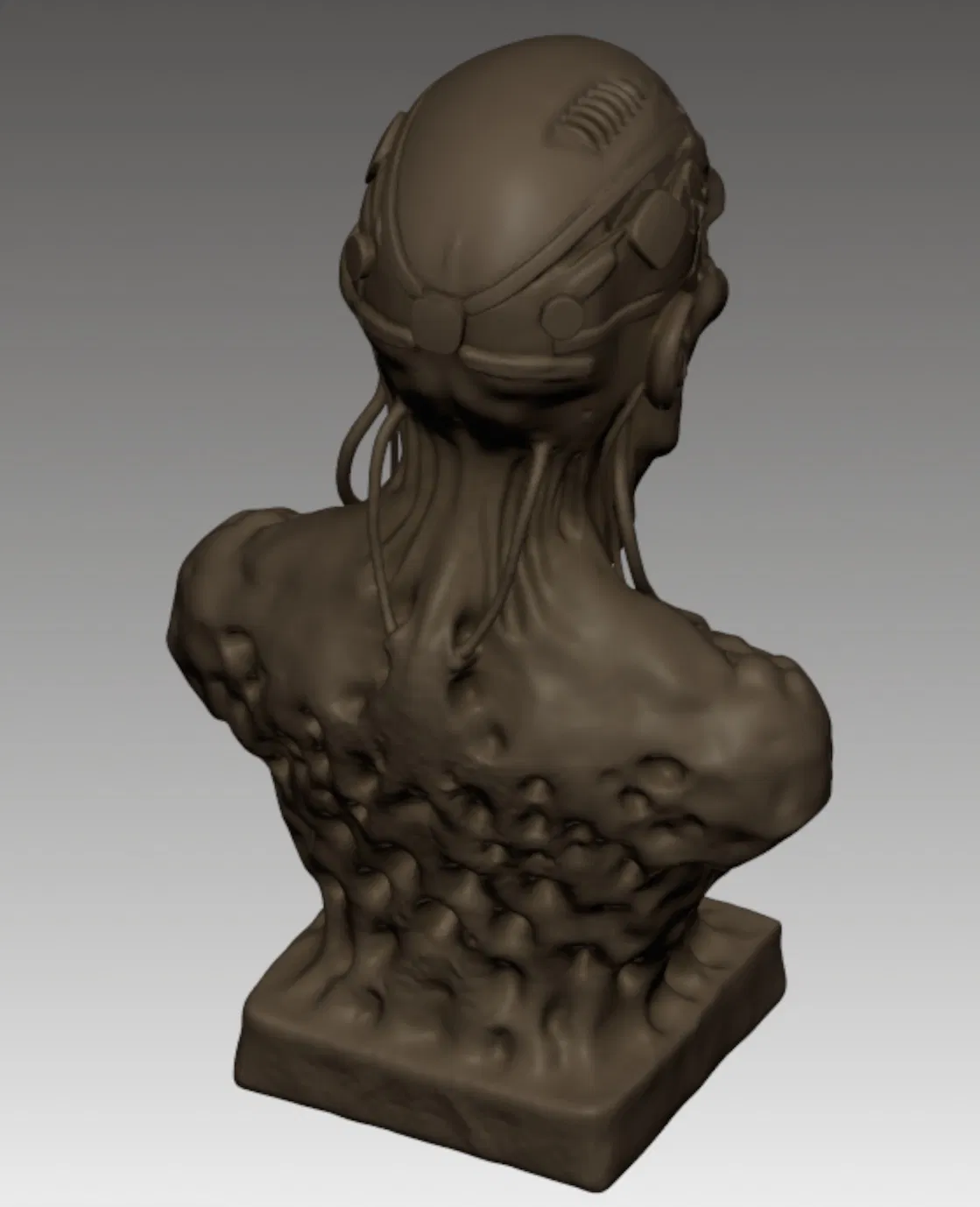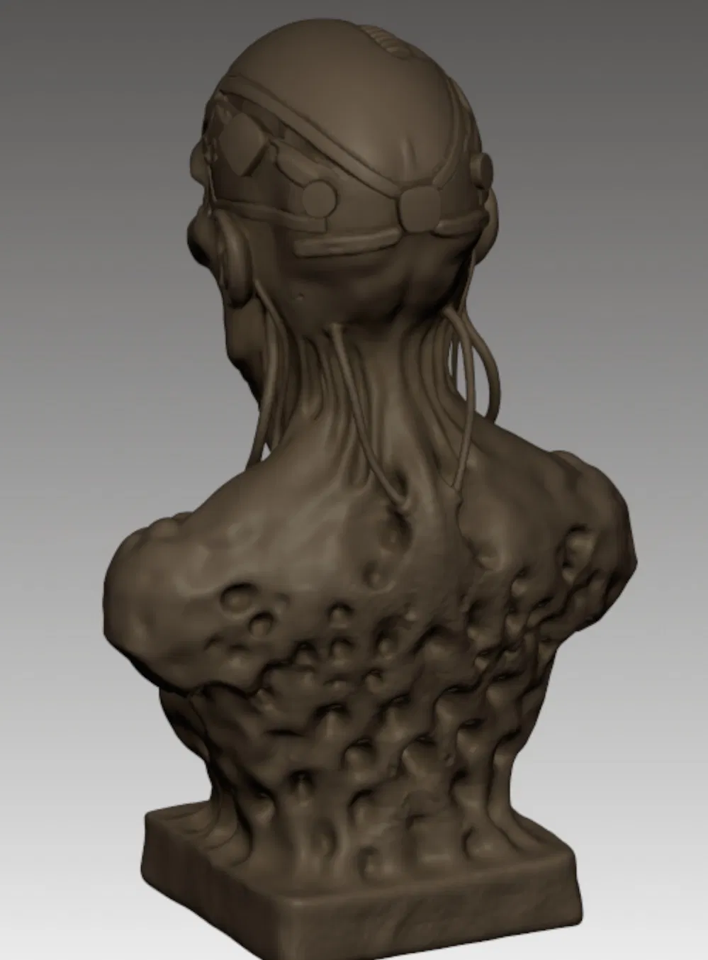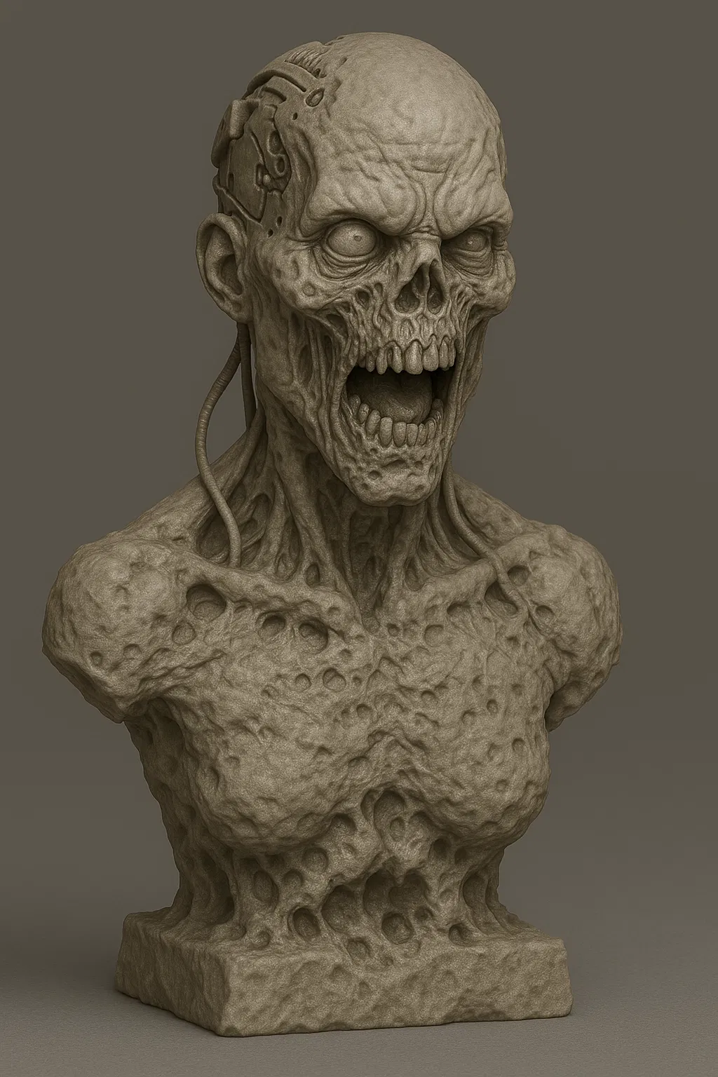 Cái tượng bán thân ghê rợn này khắc họa một xác sống cyborg đang phân hủy, với làn da mục rữa, cấu trúc xương lộ ra, và các bộ phận cơ khí sinh học gắn chặt vào hộp sọ. Được thiết kế với độ chi tiết cực cao, nó nắm bắt trọn vẹn tinh thần của thể loại kinh dị khoa học viễn tưởng và nghệ thuật xác sống ghê tởm.
