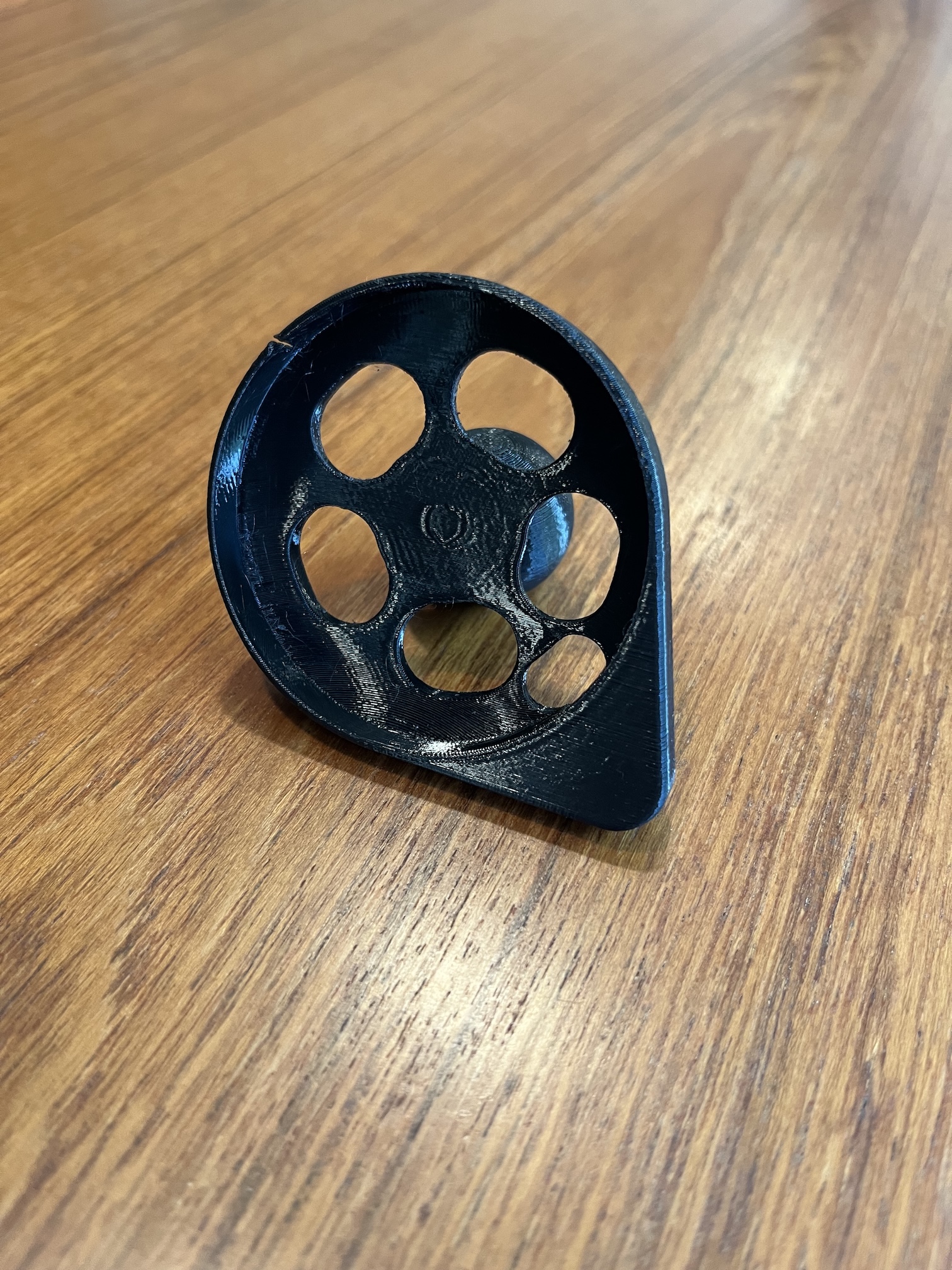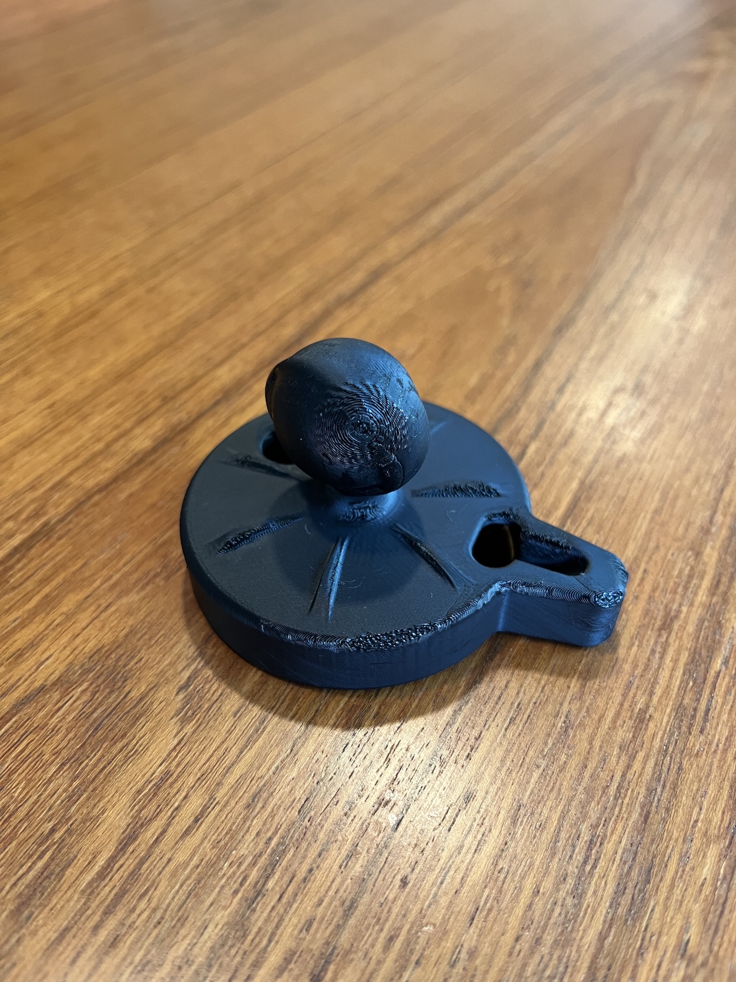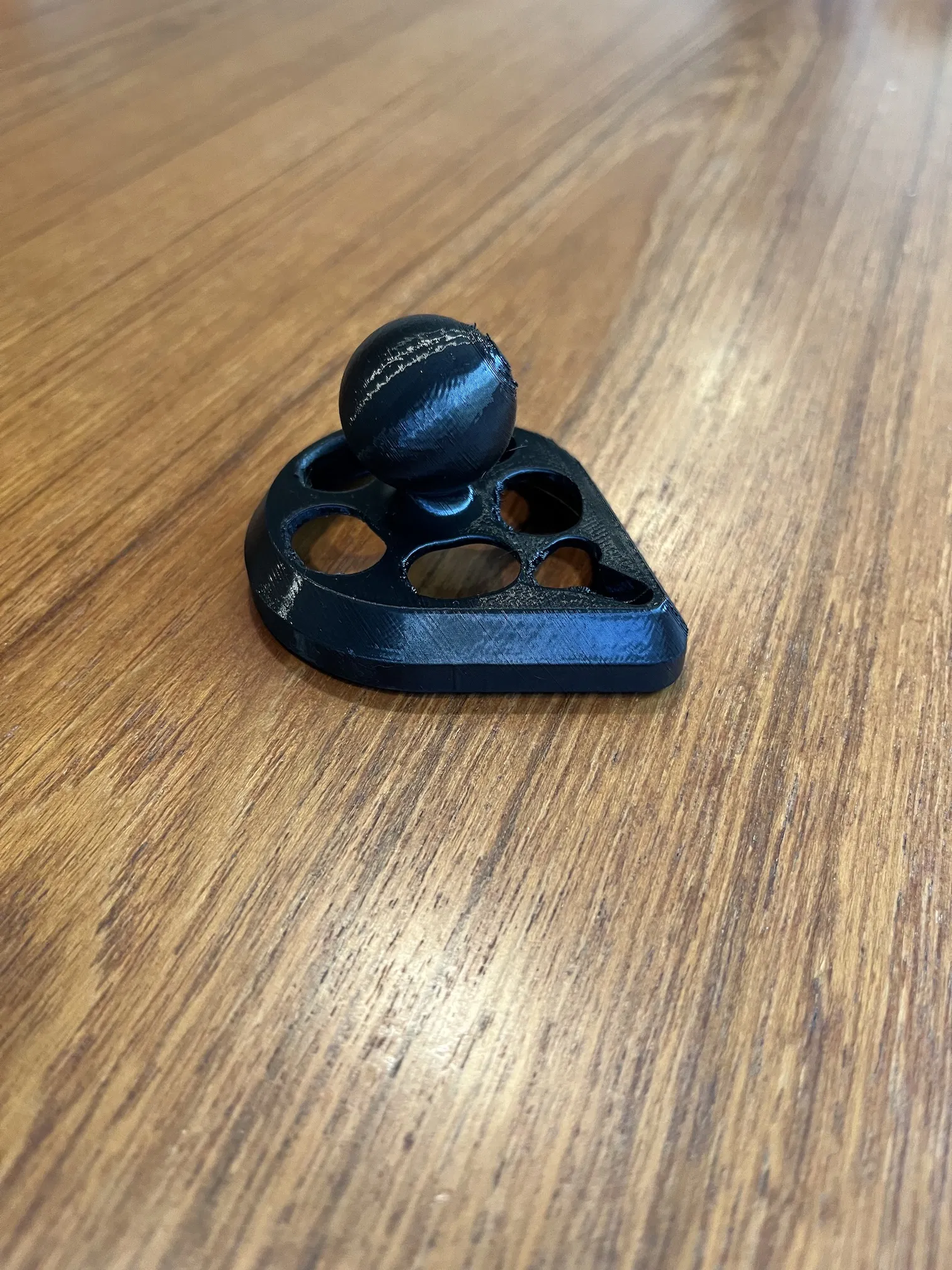 Chỗ duy nhất tui thấy bị biến dạng là ở cái đế bi RAM, chỗ này bị nén ép. Xe màu đen của tui đậu dưới nắng California trực tiếp ngày nào cũng vậy. Đây là bản V1 in bằng Bambu PETG-HF/3 lớp tường/15% vật liệu độn và để trong xe cả mùa hè.