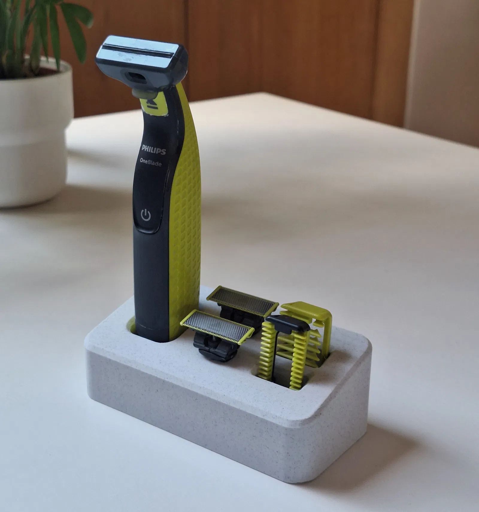 Cái chân đế này để dựng máy Philips OneBlade, có chỗ cắm thân máy, 2 lưỡi dao dự phòng và 2 phụ kiện. Phần đáy có lỗ gắn đế cao su, giúp máy đứng vững. Nên in với infill 25% và 50% cho phần đáy để tăng khối lượng và tránh xê dịch.