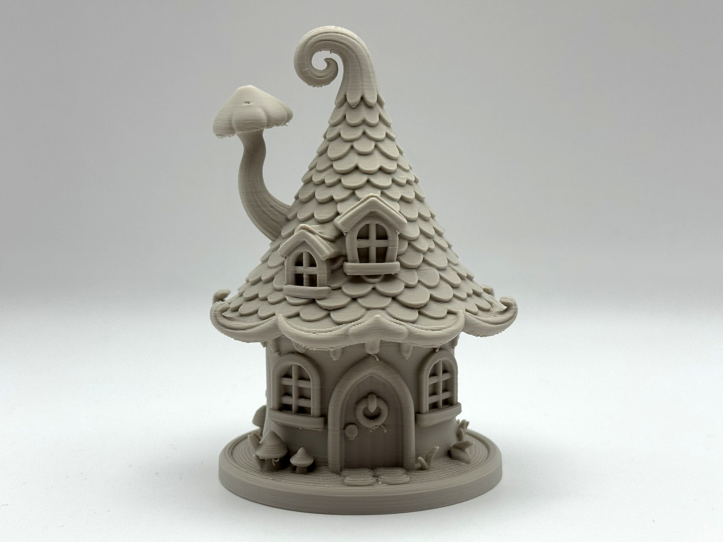 Mang phép thuật vào bản in của bạn với Nhà Cổ Tích Dễ Thương này! Hoàn hảo cho vườn cổ tích, đồ trang trí kệ hoặc dioramas giả tưởng, mô hình có mái nhà xoắn, ống khói nấm và cửa sổ viền đá. Cần ít support hữu cơ.