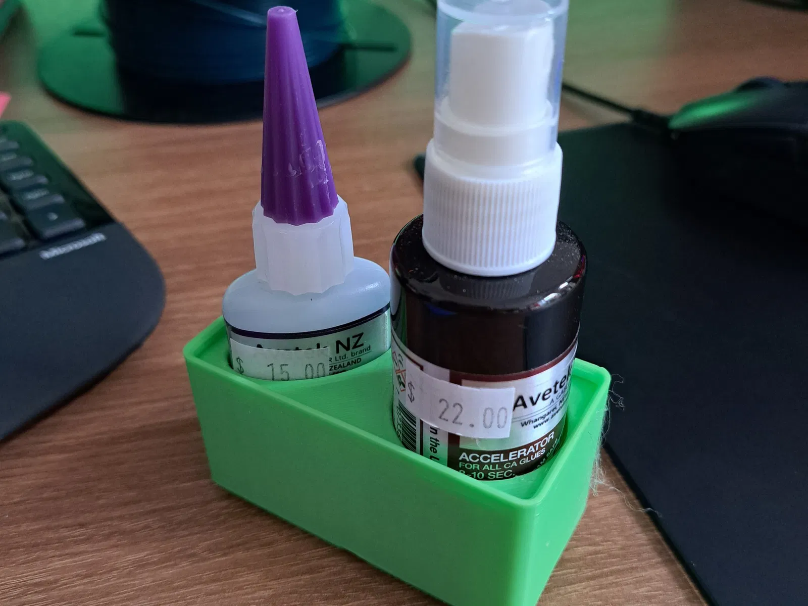 Gridfinity được thiết kế để giữ 2 món đồ đi cùng nhau, Cyanoacrylate (keo siêu dính) và Accelerator.