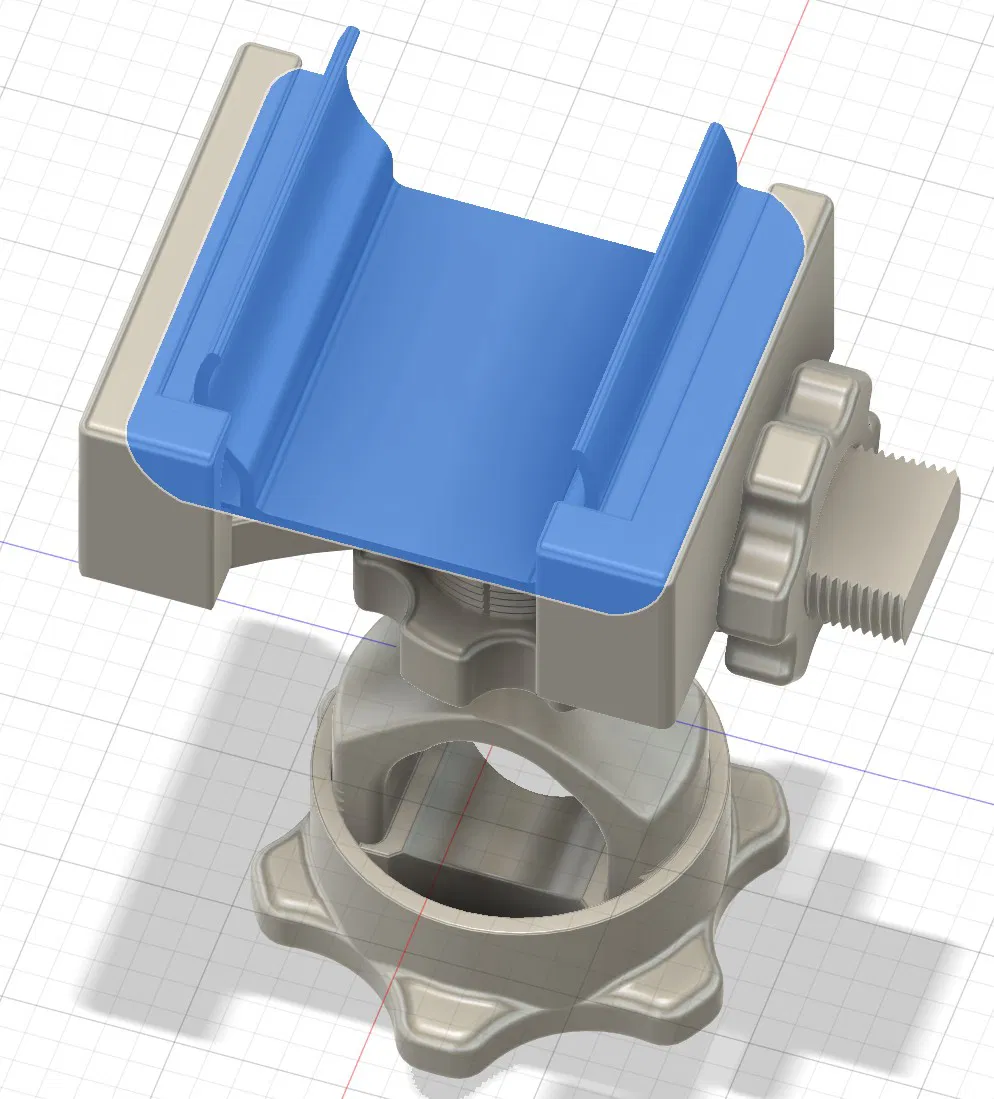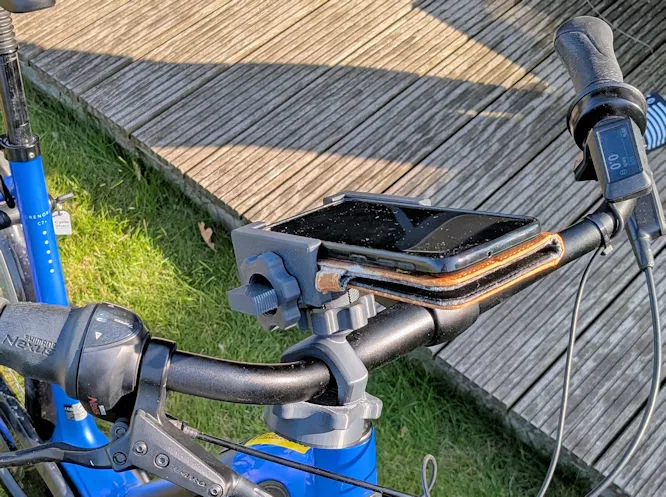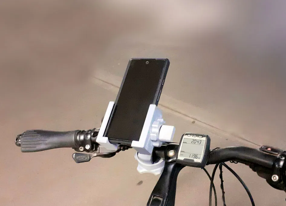 Giá đỡ điện thoại xe đạp phổ dụng, gắn không cần dụng cụ, có khớp bi. Dùng cho ghi đông 23-32 mm, kẹp điện thoại 73-92 mm. In bằng ASA hoặc ABS, có hướng dẫn lắp ráp chi tiết.