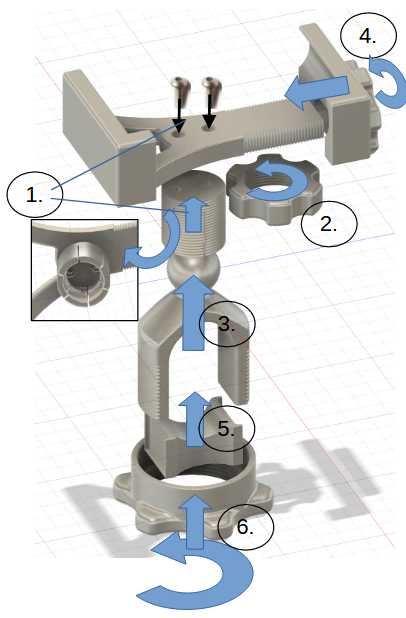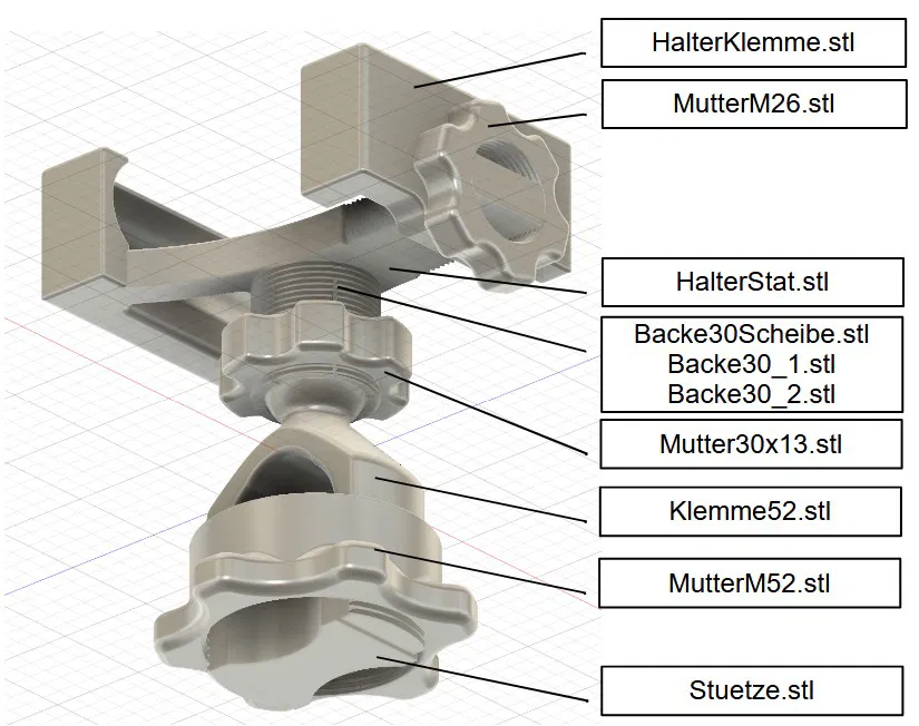 Trượt hàm kẹp (HalterKlemme.stl) lên giá đỡ (HalterStat.stl) và cố định bằng đai ốc M26 (MutterM26.stl).