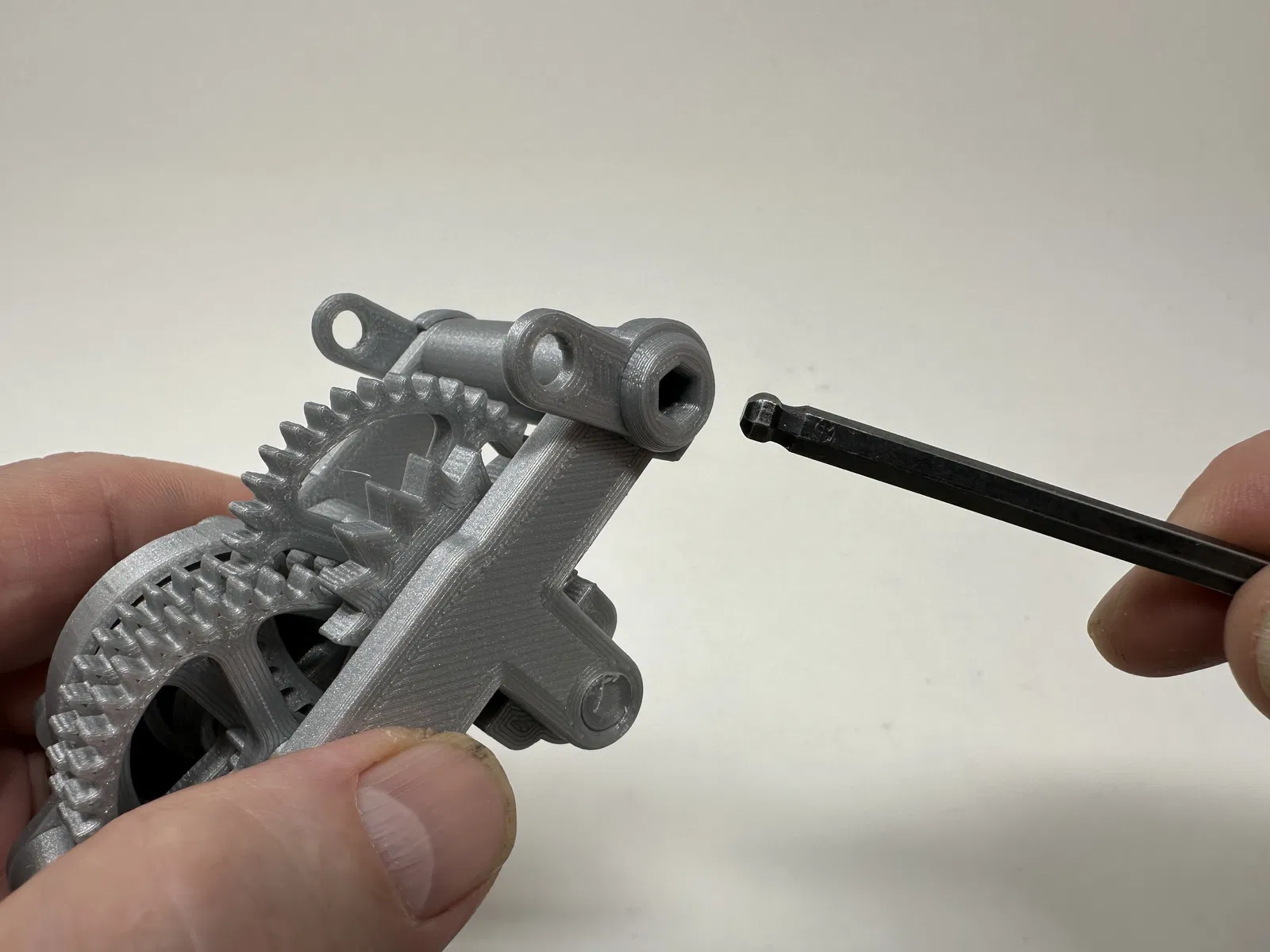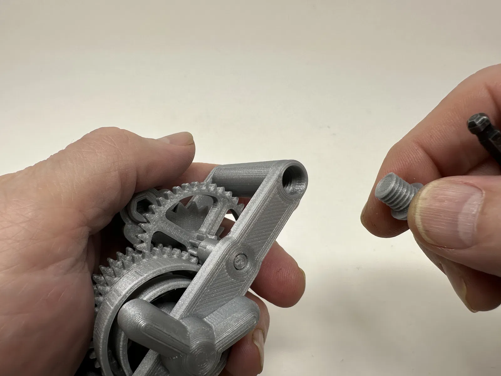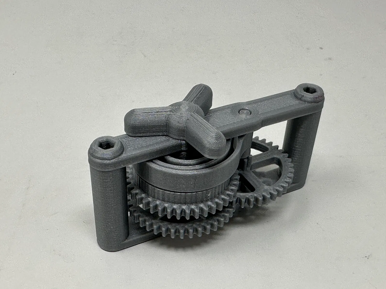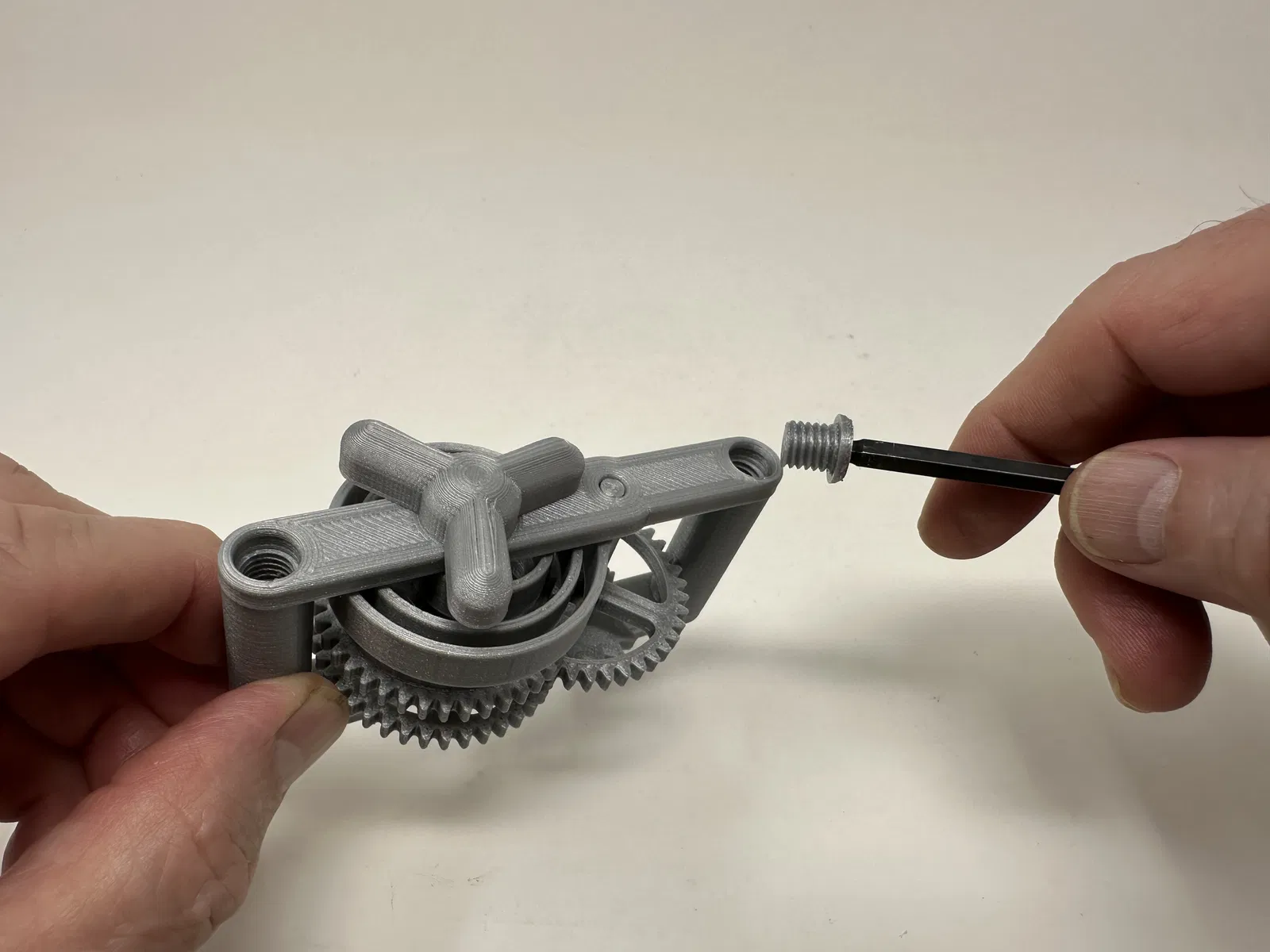 Cơ cấu này là một bản in và lắp ráp có độ chính xác cao, đôi khi sử dụng các bộ phận in 3D có độ chính xác rất nhỏ trong không gian hạn chế với sự căn chỉnh có độ chính xác cao. Trước khi lắp ráp, tôi đã thử lắp và cắt, dũa, khoan, chà nhám, v.v., tất cả các bộ phận khi cần thiết để các bề mặt chuyển động di chuyển trơn tru và các bề mặt không di chuyển vừa khít. Tùy thuộc vào slicer, máy in, cài đặt máy in và màu sắc bạn đã chọn, bạn có thể cần cắt, dũa, khoan và/hoặc chà nhám nhiều hay ít để tái tạo thành công mô hình này. Tôi đã cẩn thận dũa tất cả các cạnh tiếp xúc với tấm đế để đảm bảo loại bỏ tất cả các vết chảy ra khỏi tấm đế và tất cả các cạnh đều nhẵn bằng cách sử dụng các tệp trang sức nhỏ và nhiều sự kiên nhẫn.