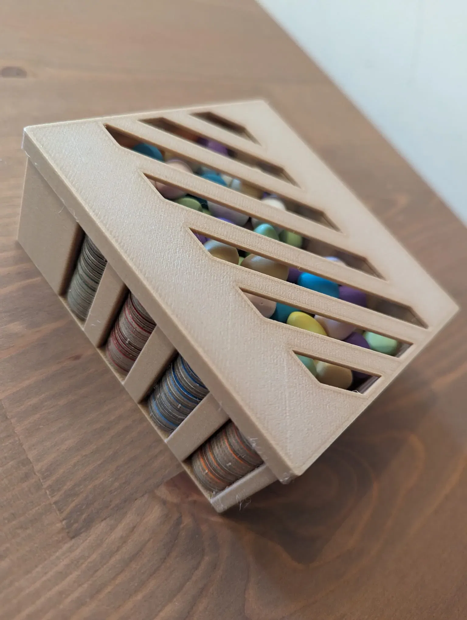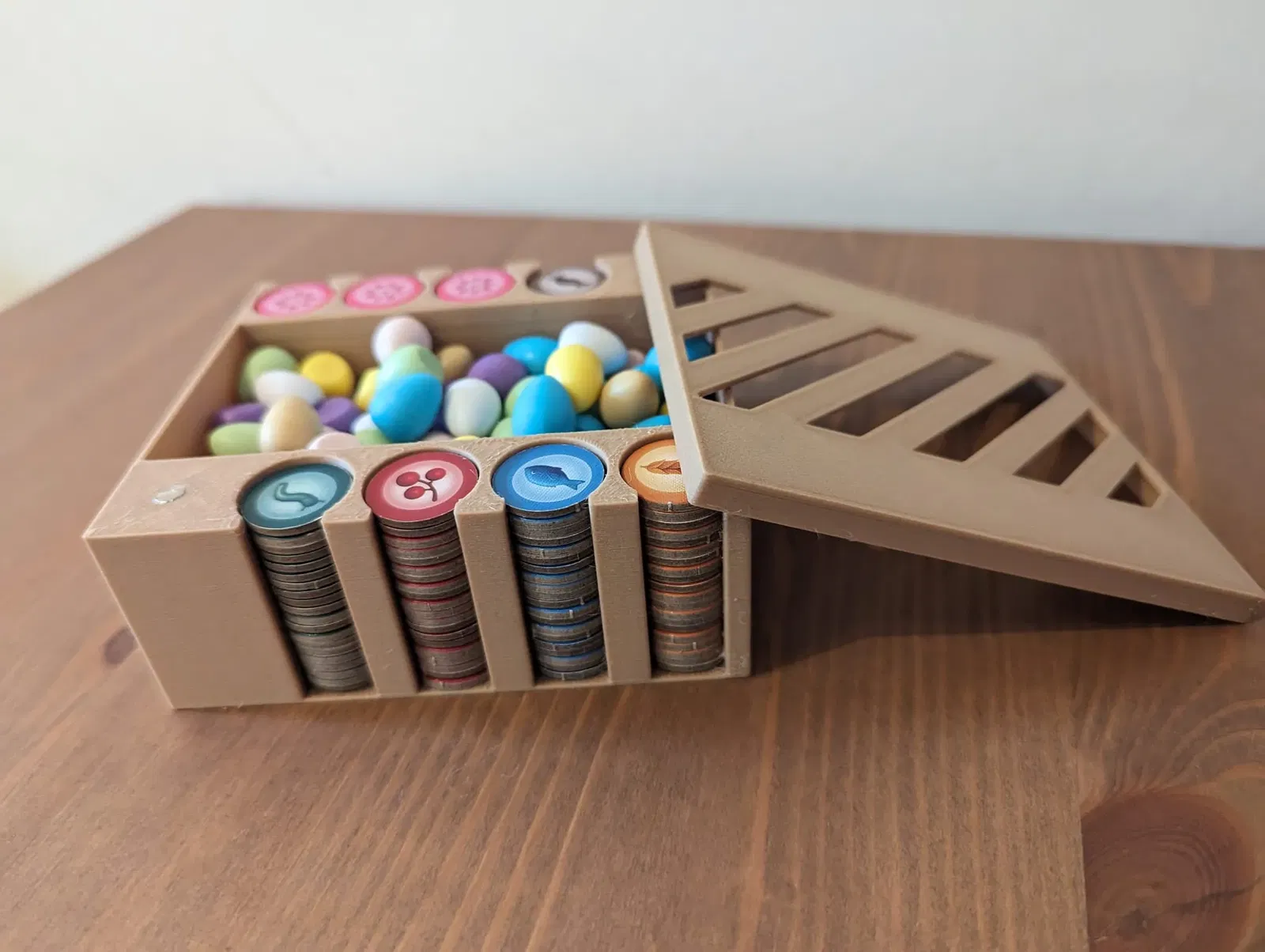 Một hộp để chứa các token thực phẩm Wingspan của bạn (bao gồm cả nectar) và trứng. Mô hình sử dụng bốn nam châm 5x1mm để có sự vừa vặn tốt hơn. Tốt nhất là bạn nên dán chúng bằng keo siêu dính.