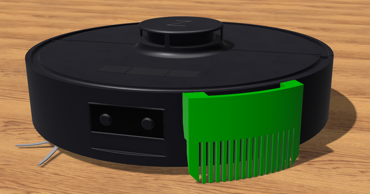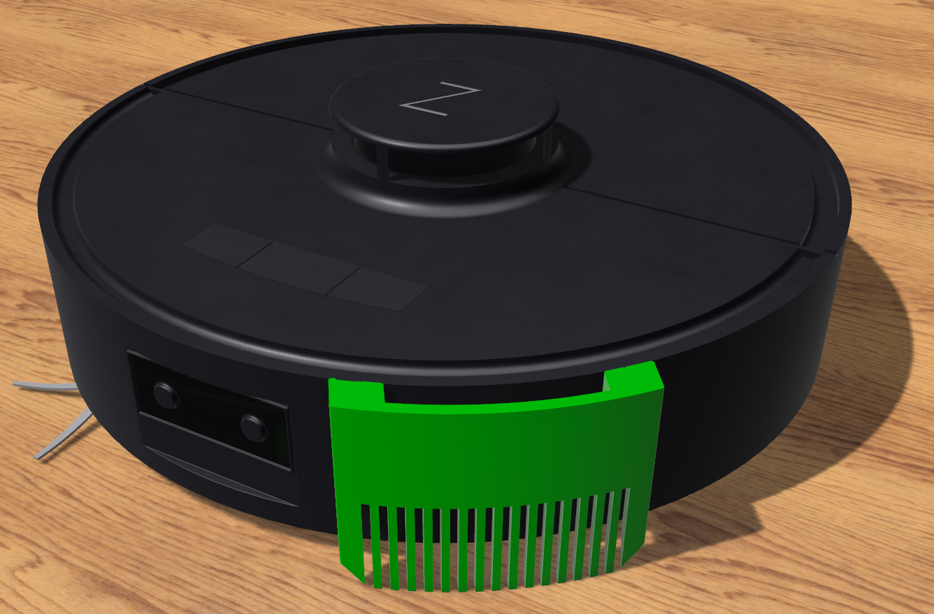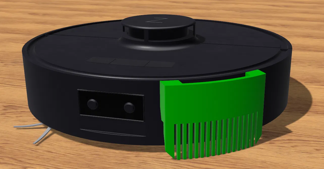 Cái kẹp lược gắn phía trước này giúp gom lông thú cưng dài trước khi chúng làm rối chổi hút bụi robot của bạn. Tui thì tui dán nó bằng băng keo hai mặt lên bên hông là ok liền. Nó gom lông mèo tốt lắm luôn đó!