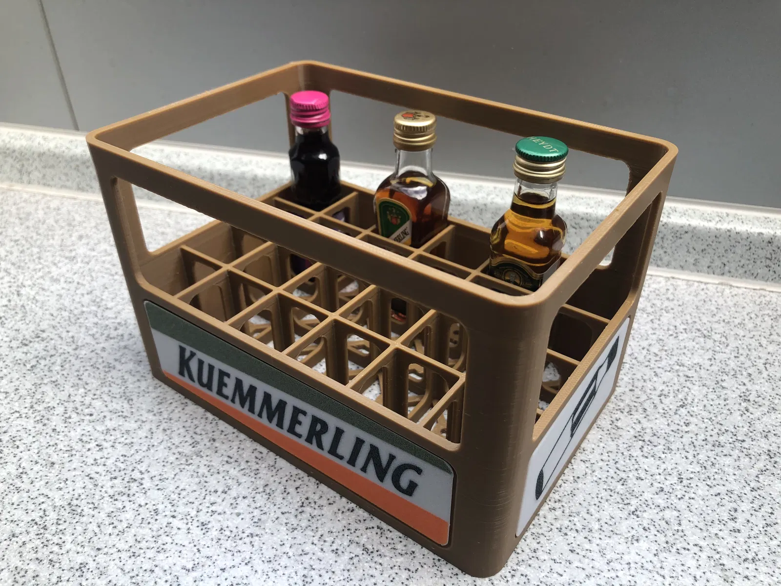 Thế hệ thứ 2 của hộp đựng chai Hubertus, Kuemmerling và các loại khác. Phiên bản riêng lẻ và phiên bản có thể xếp chồng lên nhau. Có sẵn file STL trống và file 3mf đi kèm các tấm bảng "Kuemmerling" và "Hubertus" để in.