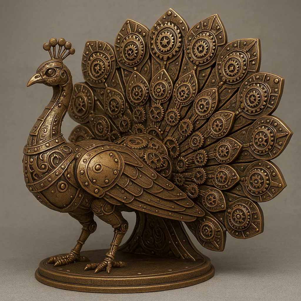 Một con công theo phong cách steampunk, với lông đuôi được làm từ bánh răng, các tấm kim loại tán và các hoa văn khắc bằng đồng thau tinh xảo.