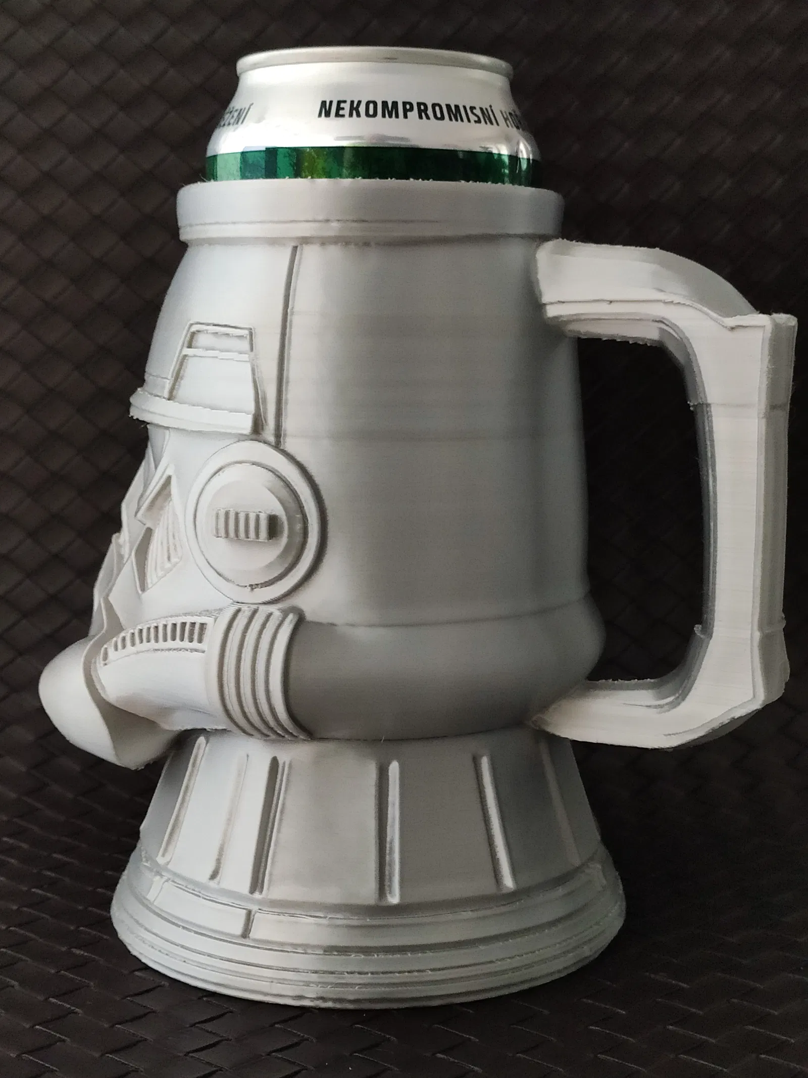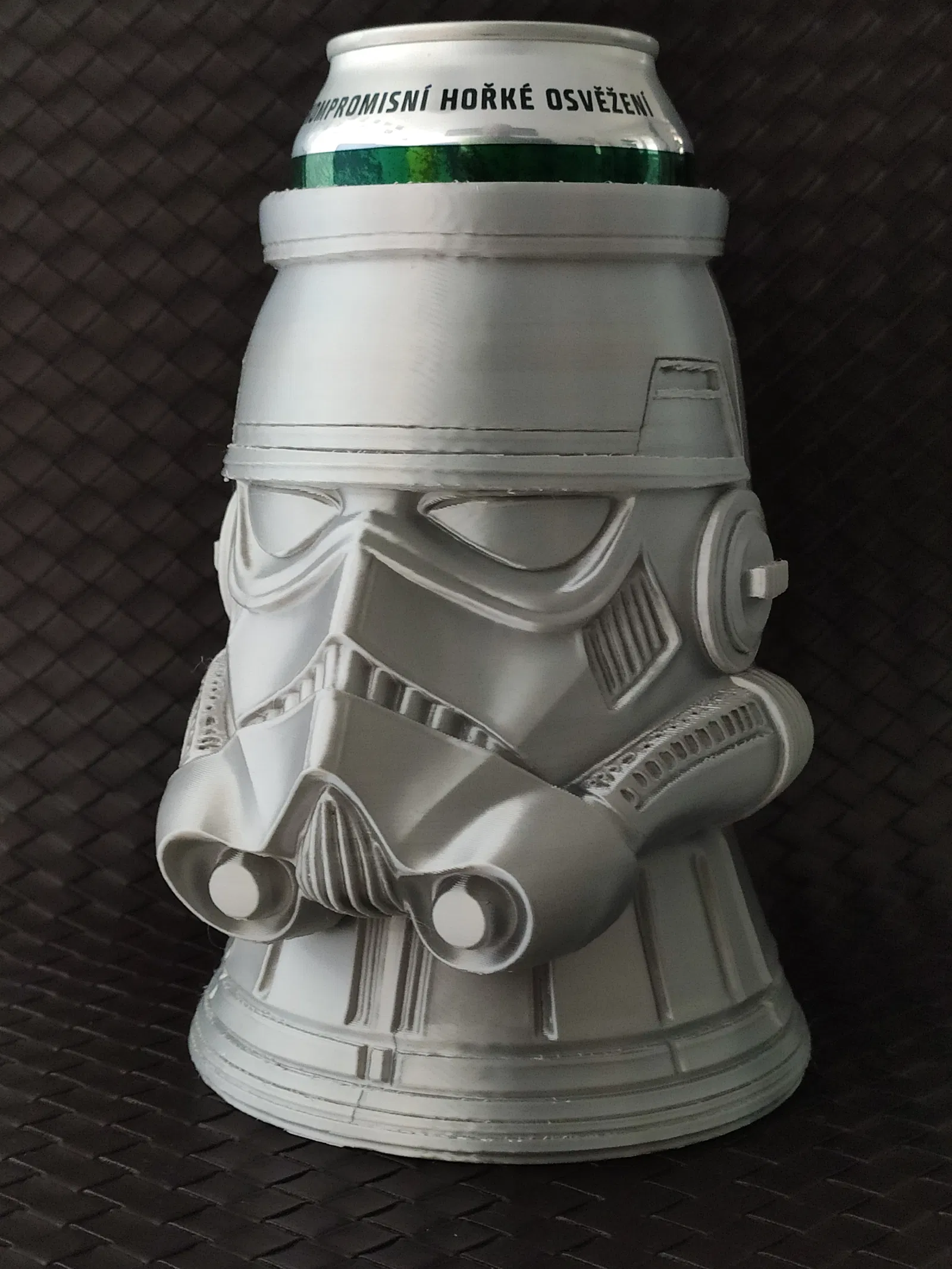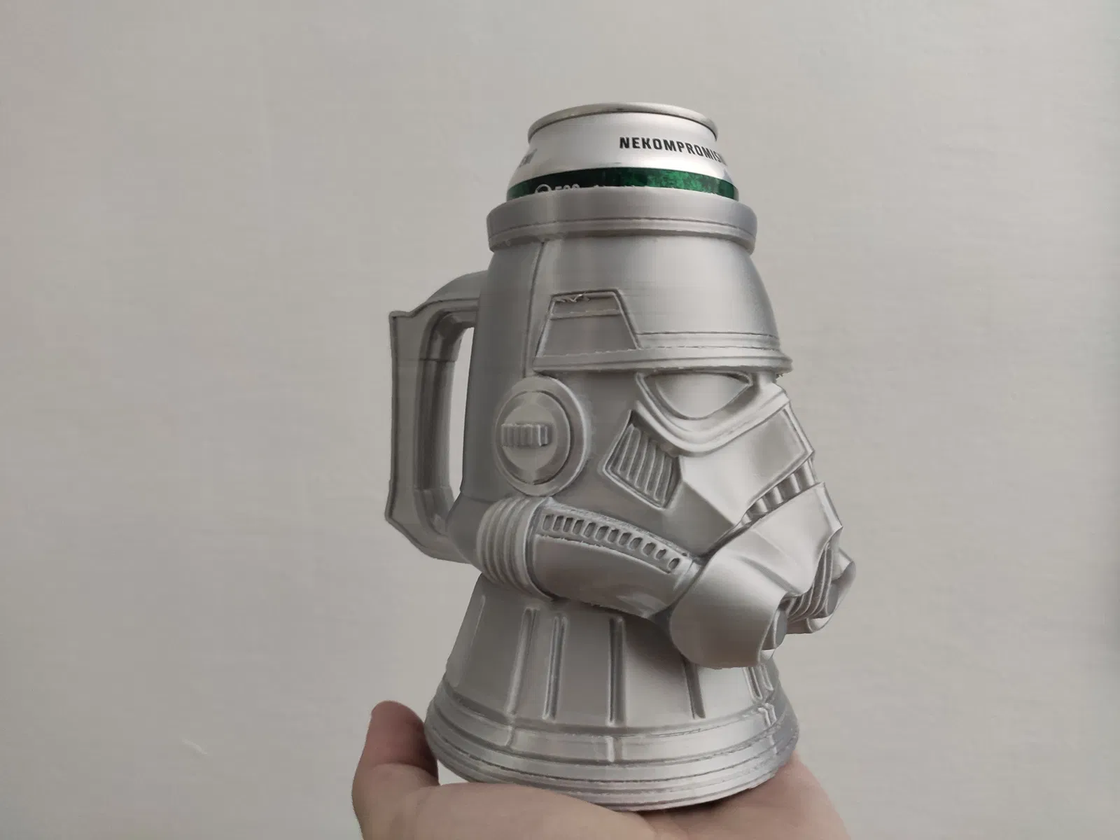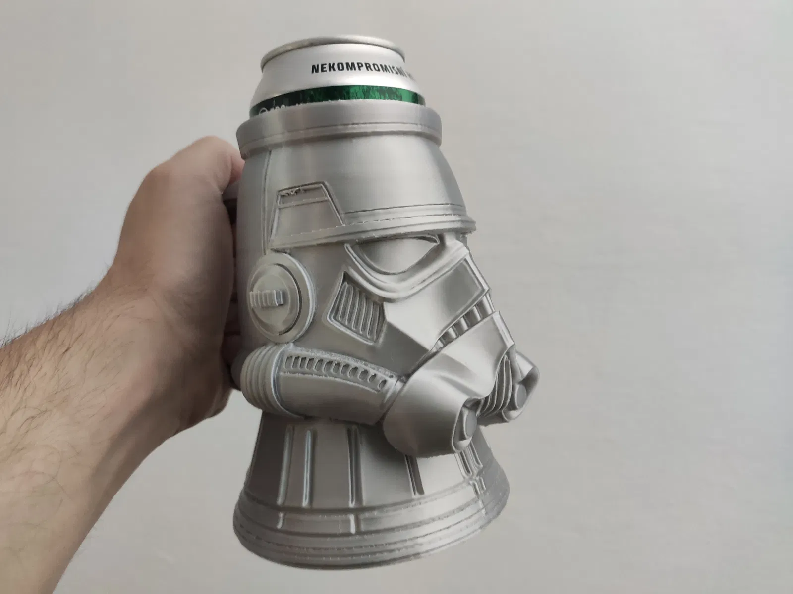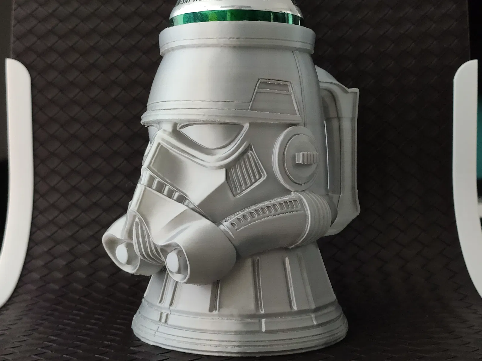 Giá đỡ lon bia hình StormTrooper, vừa lon 0.5L hoặc lon 12oz/330ml slim với miếng chèn đi kèm. Cài đặt in gợi ý: PLA, lớp 0.2mm, hỗ trợ cây. Có thể lật tay cầm, tùy chỉnh kích thước miếng chèn.