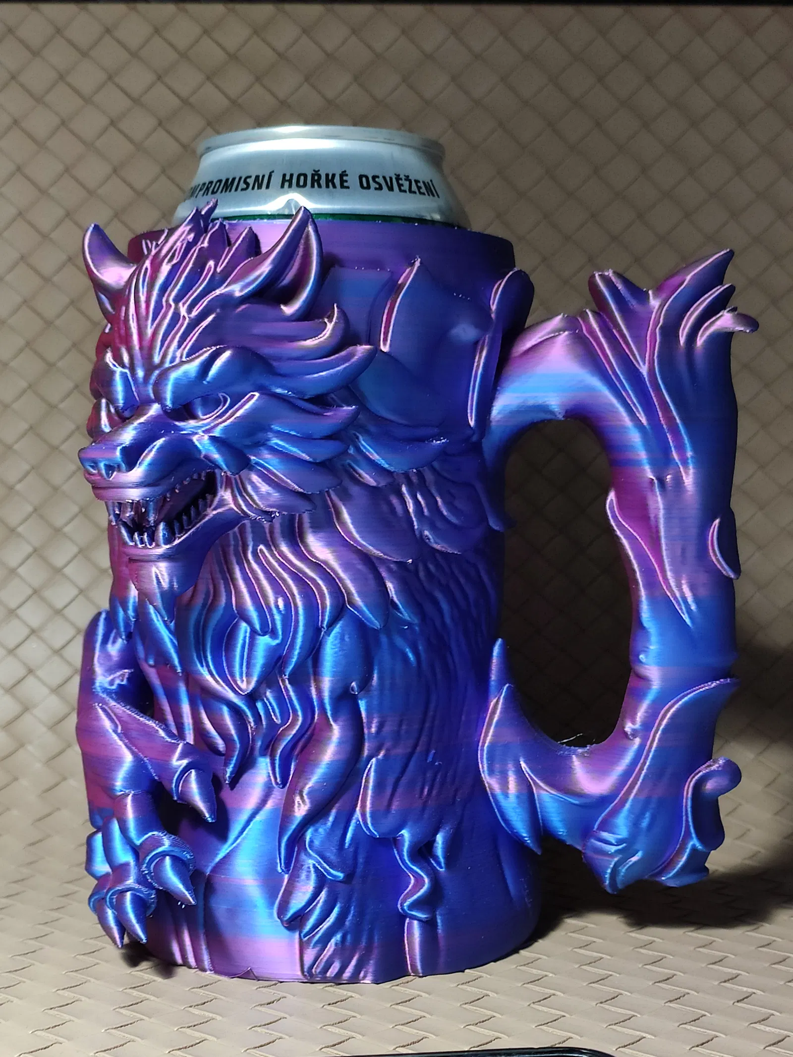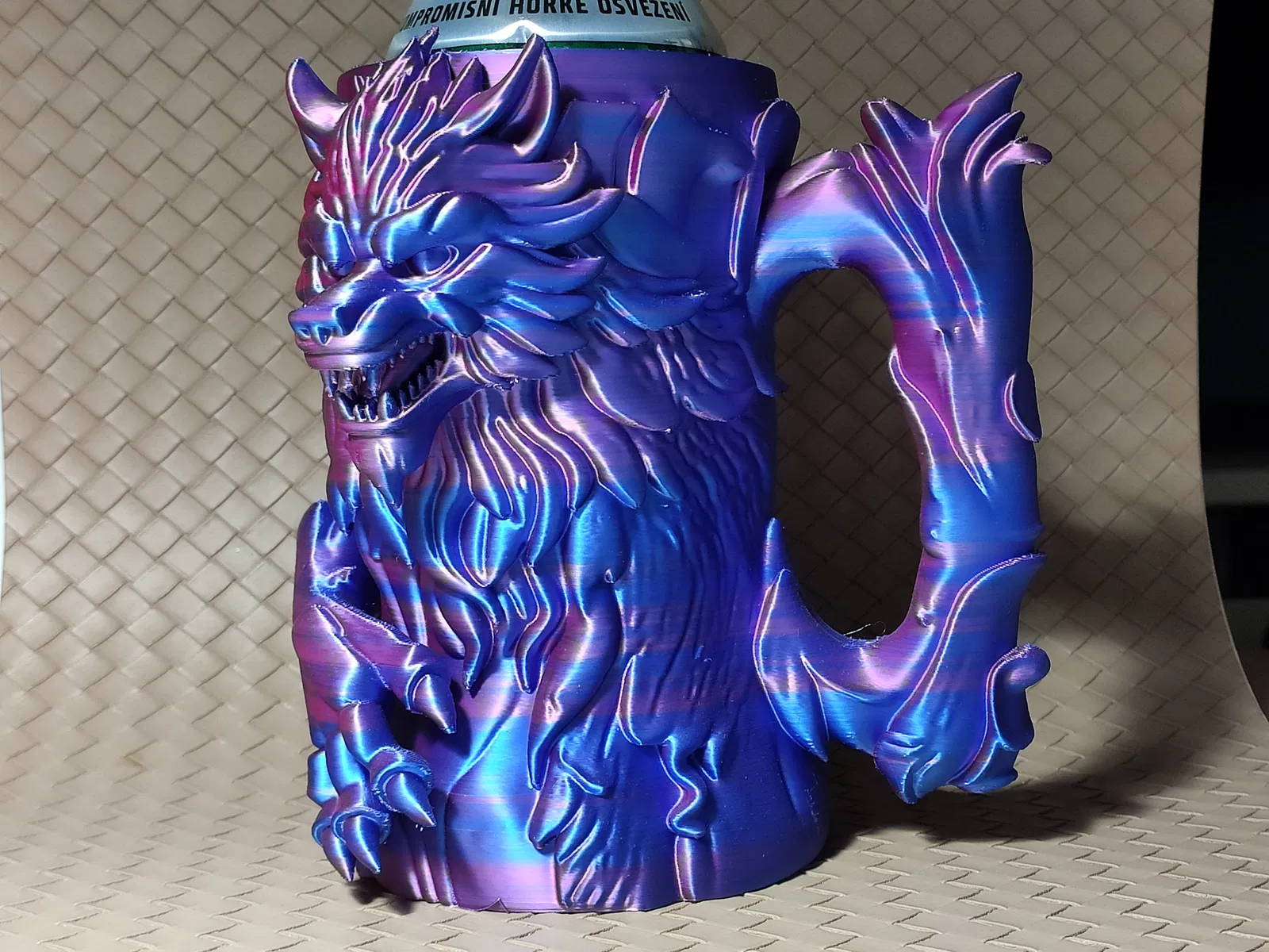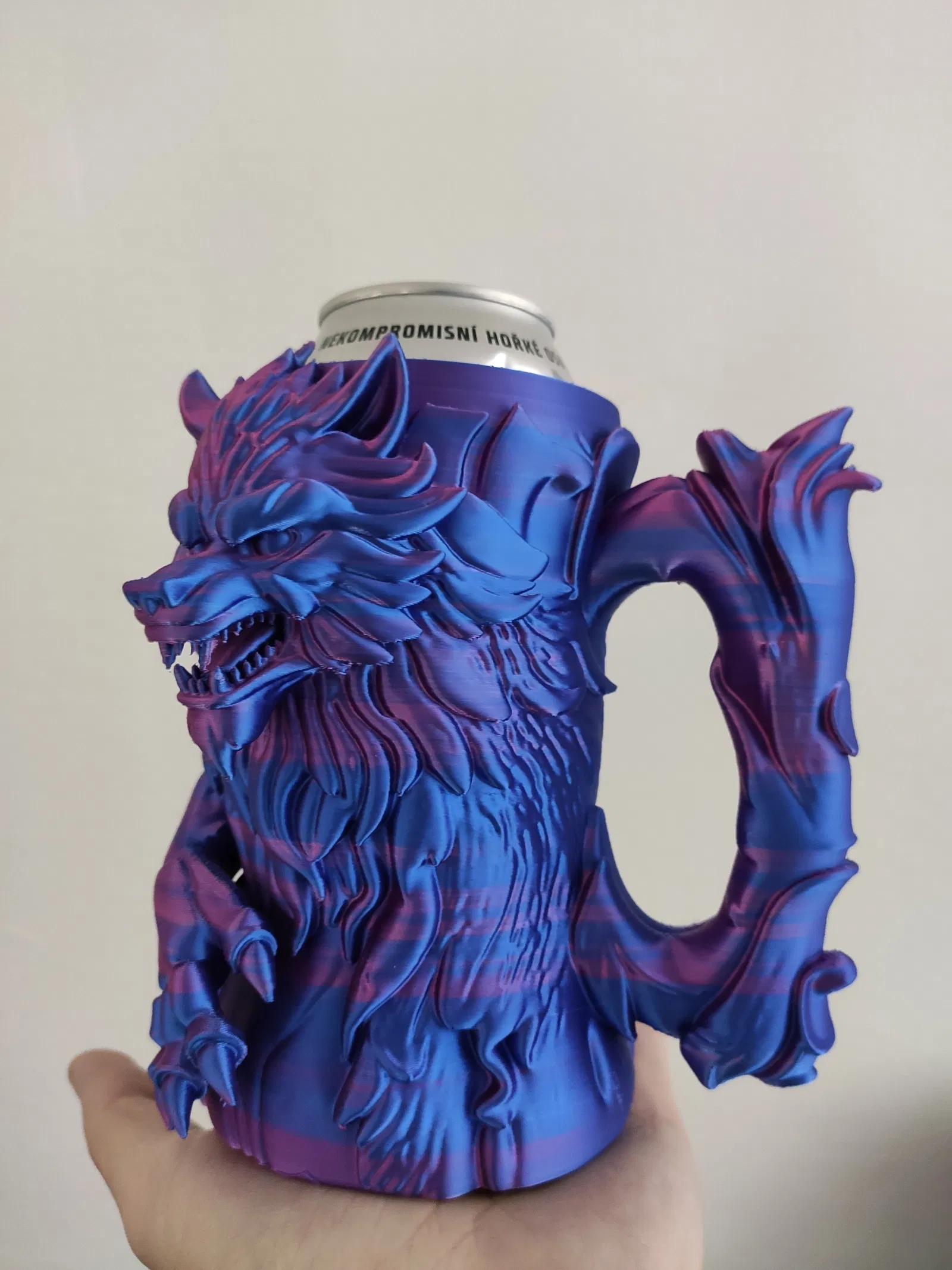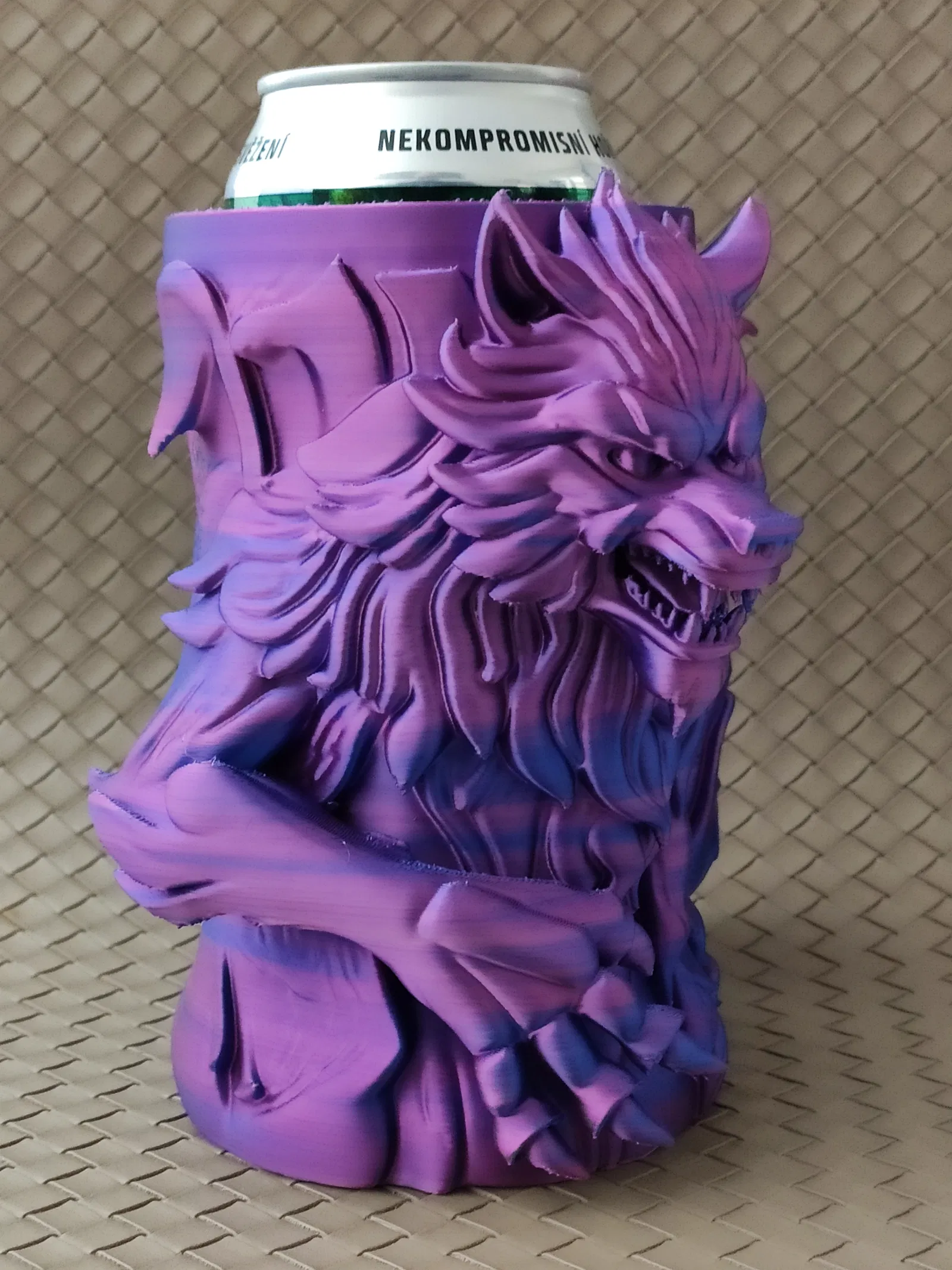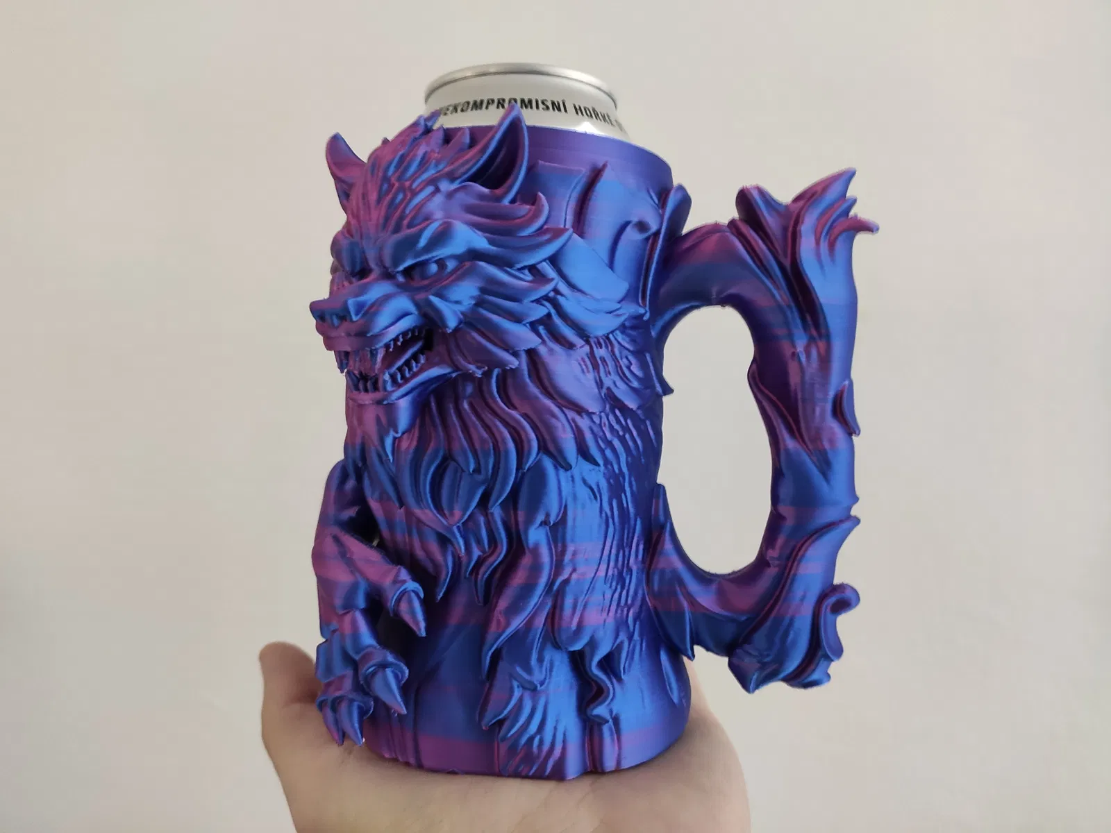 Giá đỡ lon hình Người Sói độc đáo, giữ lon 0.5L tiêu chuẩn châu Âu. Có tùy chọn đế lót cho lon 12oz hoặc 330ml slim, cùng bộ nâng cao hơn. In bằng PLA với cài đặt khuyến nghị. Tay cầm có thể lật ngược dễ dàng. Tuyệt vời cho bộ sưu tập và trang trí bàn làm việc.