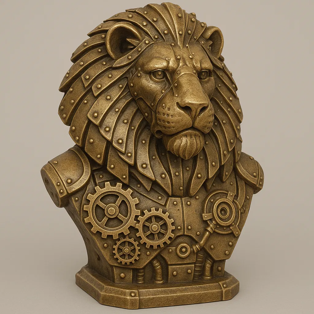 Một bức tượng bán thân hình sư tử theo phong cách steampunk, với bờm có đinh tán, bánh răng tích hợp vào ngực và các chi tiết giống đồng thau.