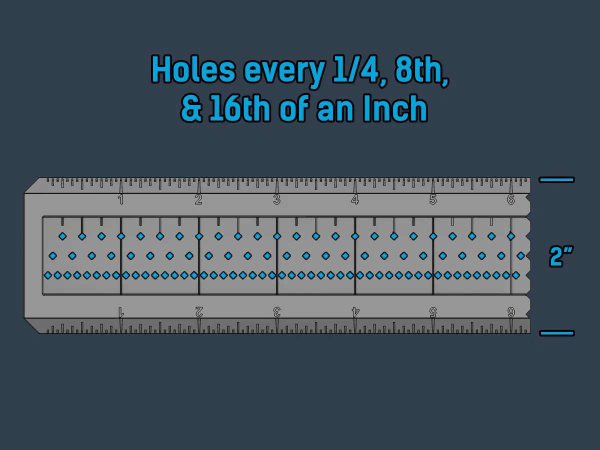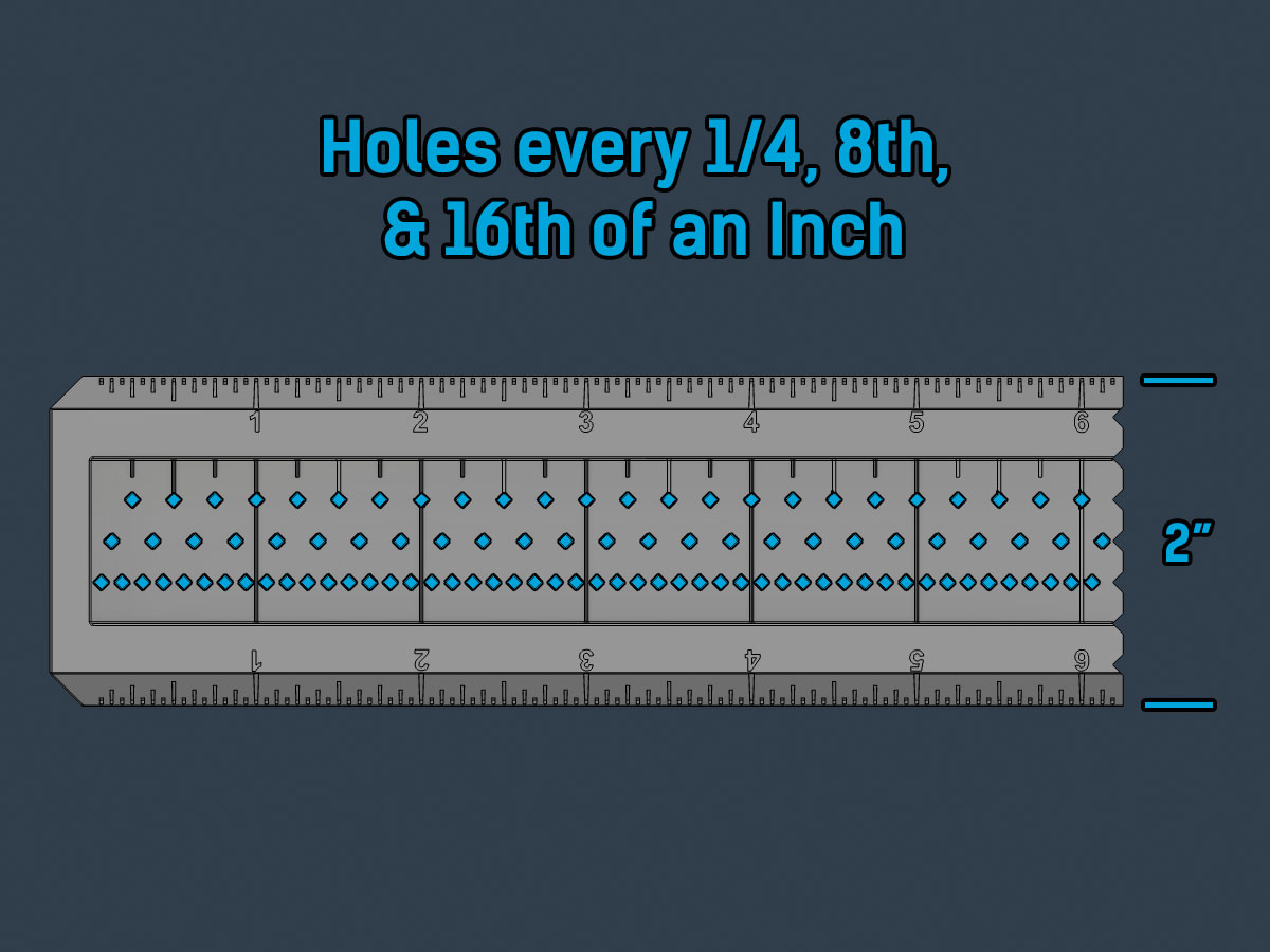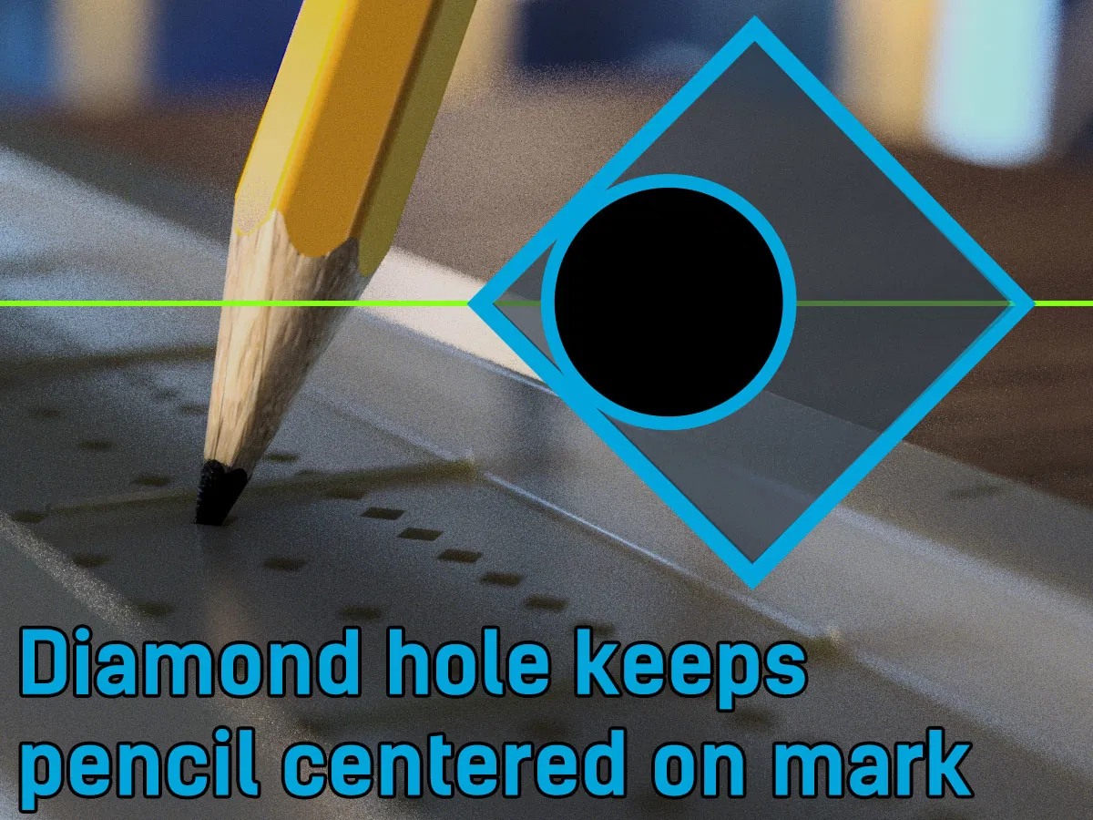 Cái thước vuông yên ngựa này cho phép bạn kẻ những đường song song với cạnh hoặc vuông góc với nó. Nó ôm lấy các góc để bạn có thể tiếp tục kẻ một đường dọc theo cạnh. Các lỗ hình kim cương giúp giữ cho bút chì của bạn ngay giữa vạch bạn đang đánh dấu và có nghĩa là chúng sẽ in dễ dàng. Các lỗ có thể chi tiết nhỏ đến 1/16 inch.