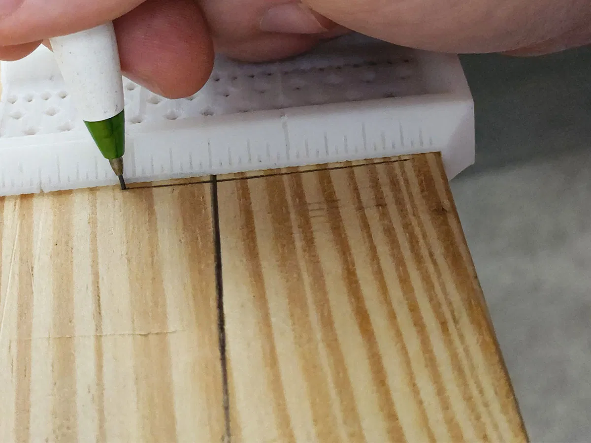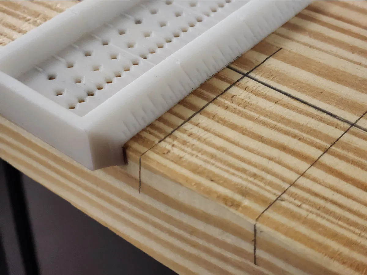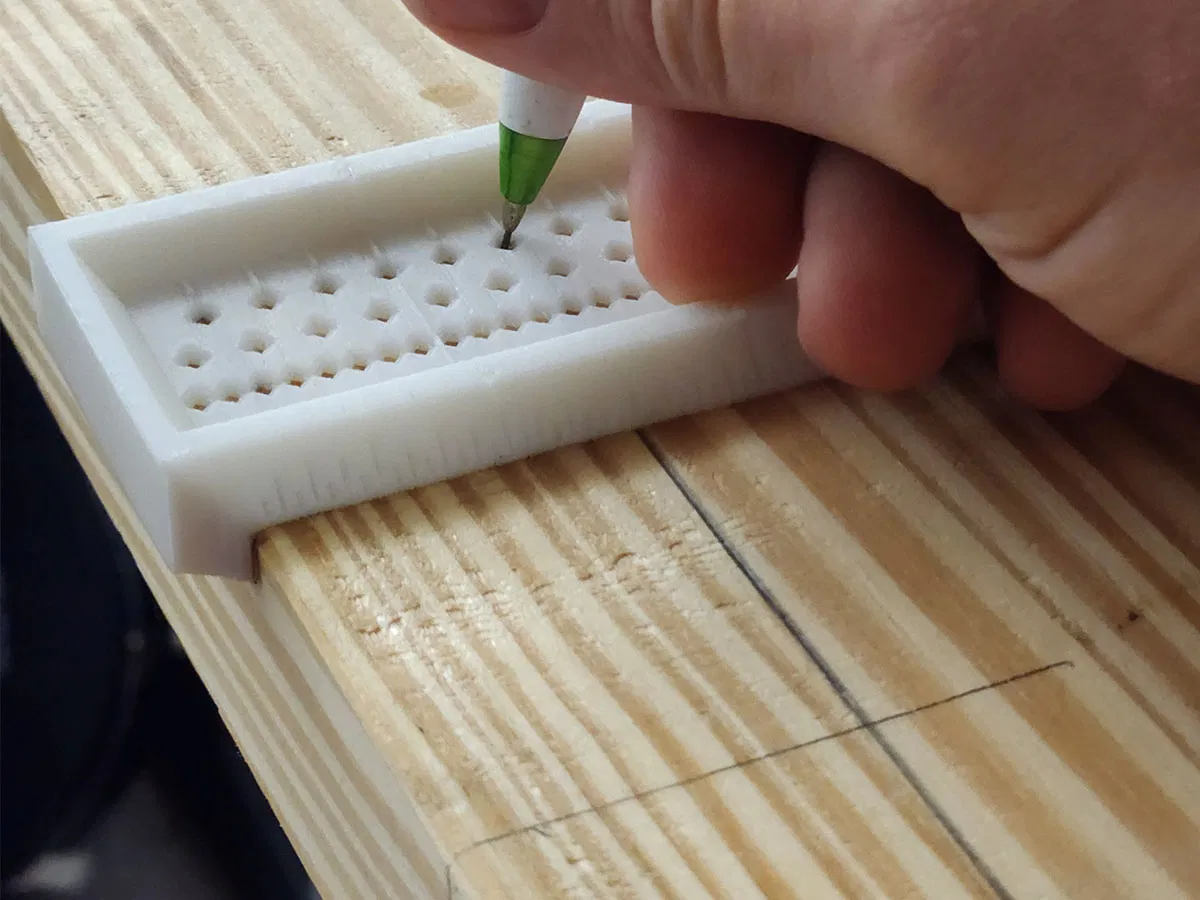Cái thước vuông yên ngựa này cho phép bạn kẻ những đường song song với cạnh hoặc vuông góc với nó. Nó ôm lấy các góc để bạn có thể tiếp tục kẻ một đường dọc theo cạnh. Các lỗ hình kim cương giúp giữ cho bút chì của bạn ngay giữa vạch bạn đang đánh dấu và có nghĩa là chúng sẽ in dễ dàng. Các lỗ có thể chi tiết nhỏ đến 1/16 inch.