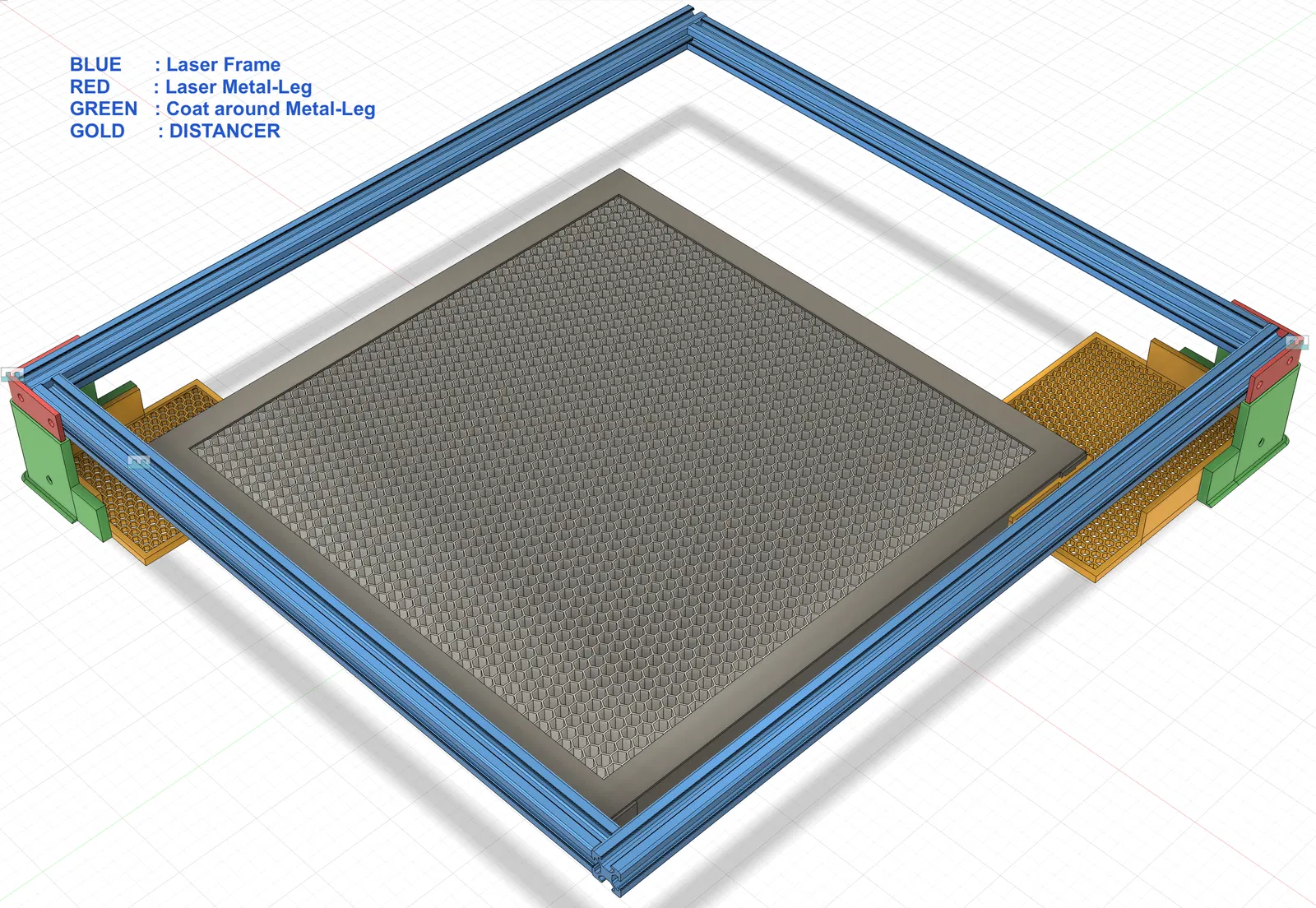 Tôi đã hiệu chỉnh vị trí gốc 0,0 của laser và căn chỉnh khung tổ ong theo các chuyển động trục x và y. Dựa trên điều này và lấy cảm hứng từ một giải pháp cho máy laser atomic ( ), tôi đã tạo ra những gì bạn thấy ở đây.