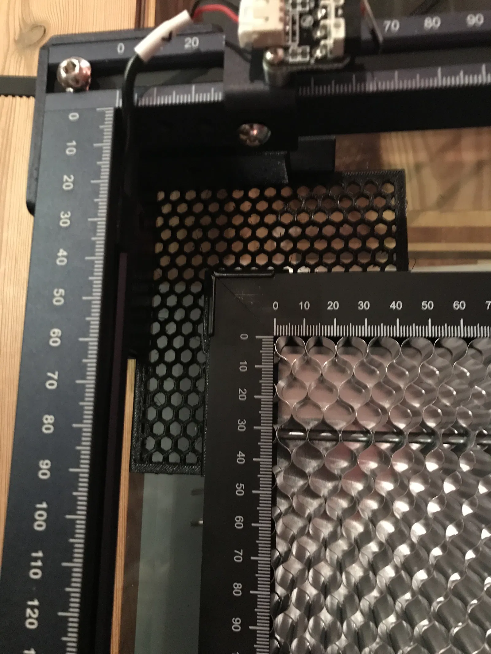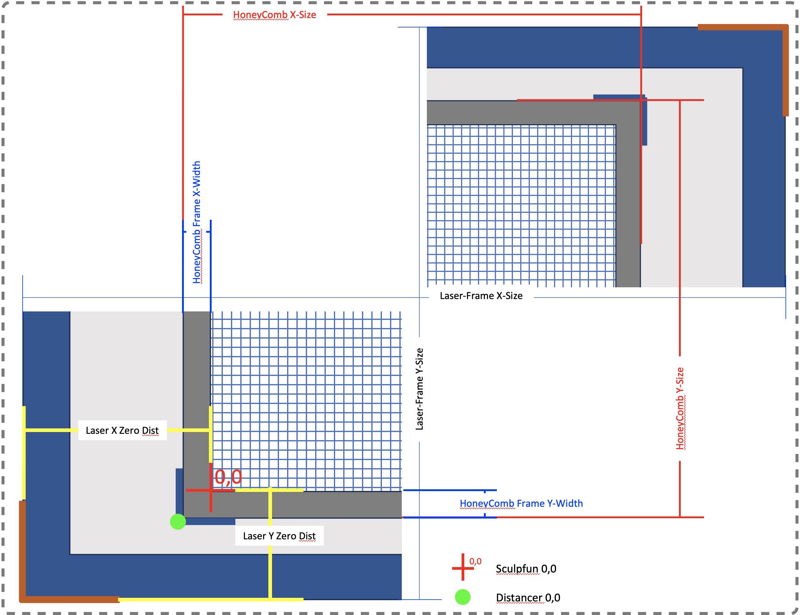 Vị trí gốc 0 x;y của laser Sculpfun cũng có sự thay đổi nhỏ, sao cho một cạnh bên trong của Tấm tổ ong khớp với vị trí gốc 0 của laser. Một số khác biệt - có lẽ cũng tùy thuộc vào vị trí công tắc hành trình, v.v.